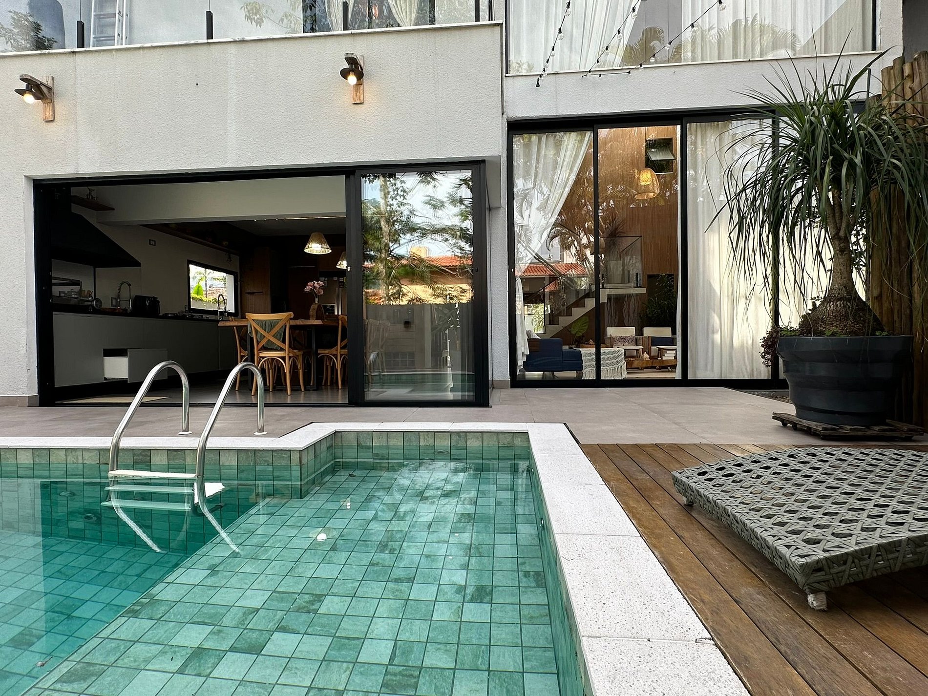 House consisting of 6 beds, which accommodate 10 people, arranged in 4 bedrooms, 4 suites and 1 toilet, integrated living room with full kitchen and gourmet balcony equipped with barbecue. Air-conditioned rooms with air conditioning. The kitchen has a refrigerator, stove, oven, microwave, coffee maker, crockery and cutlery. The Tsushida House is very complete for families and larger groups. We have an amazing movie theater that also transforms into a spacious suite! The great differential of Casa Tsushida is its integration of the internal and external areas, but with a warmth that few large houses offer.