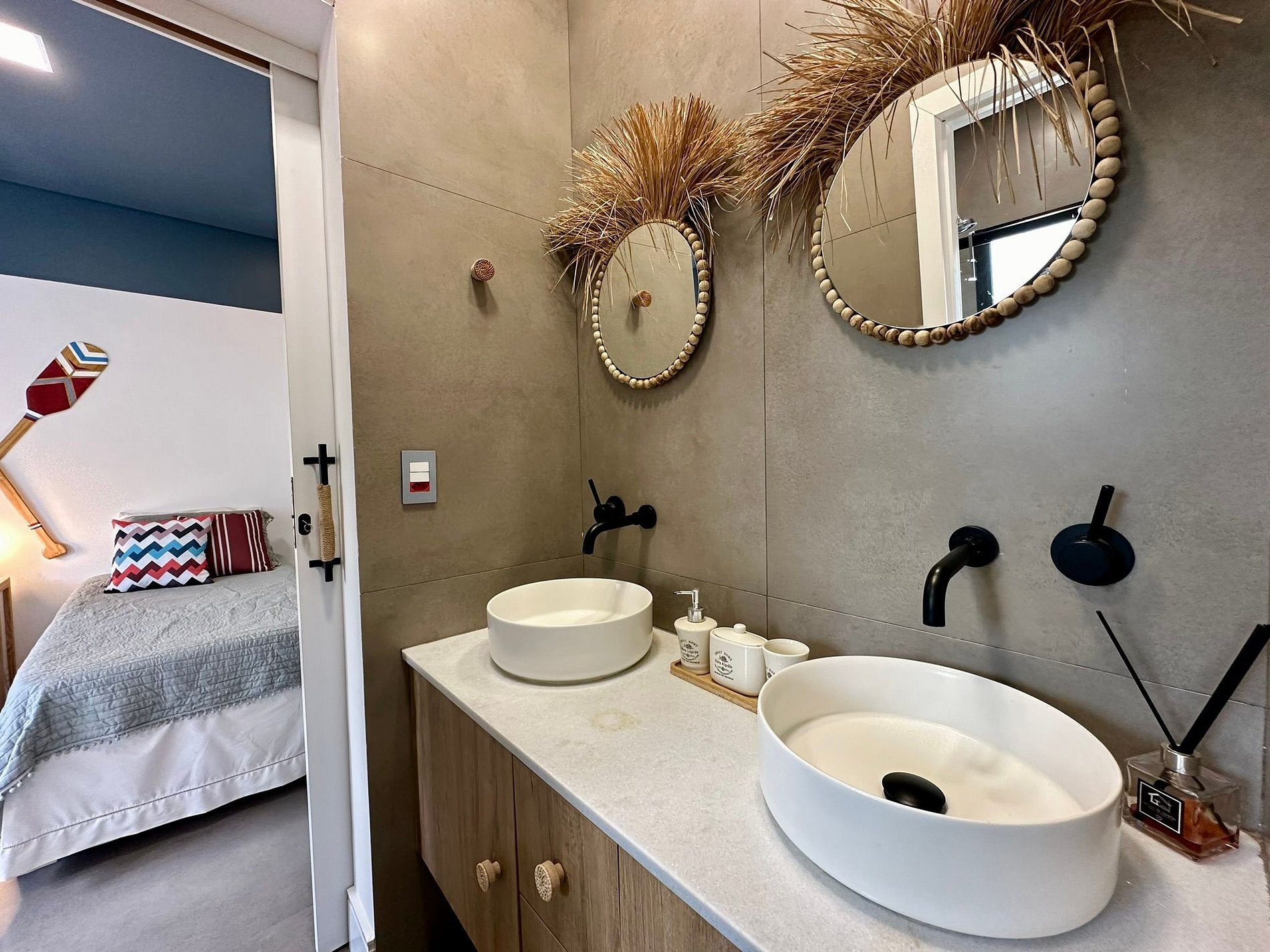 House consisting of 6 beds, which accommodate 10 people, arranged in 4 bedrooms, 4 suites and 1 toilet, integrated living room with full kitchen and gourmet balcony equipped with barbecue. Air-conditioned rooms with air conditioning. The kitchen has a refrigerator, stove, oven, microwave, coffee maker, crockery and cutlery. The Tsushida House is very complete for families and larger groups. We have an amazing movie theater that also transforms into a spacious suite! The great differential of Casa Tsushida is its integration of the internal and external areas, but with a warmth that few large houses offer.