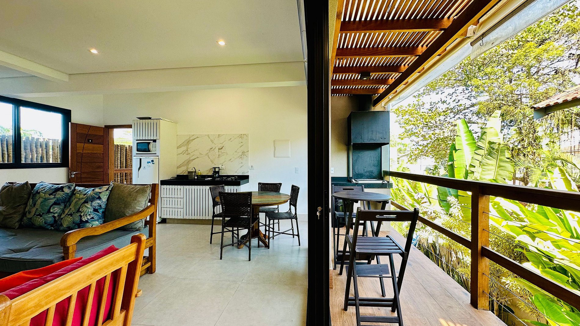 • Cozinha integrada, equipada com geladeira, cooktop, micro-ondas, cafeteira elétrica, utensílios de cozinha e louças para todas as refeições.