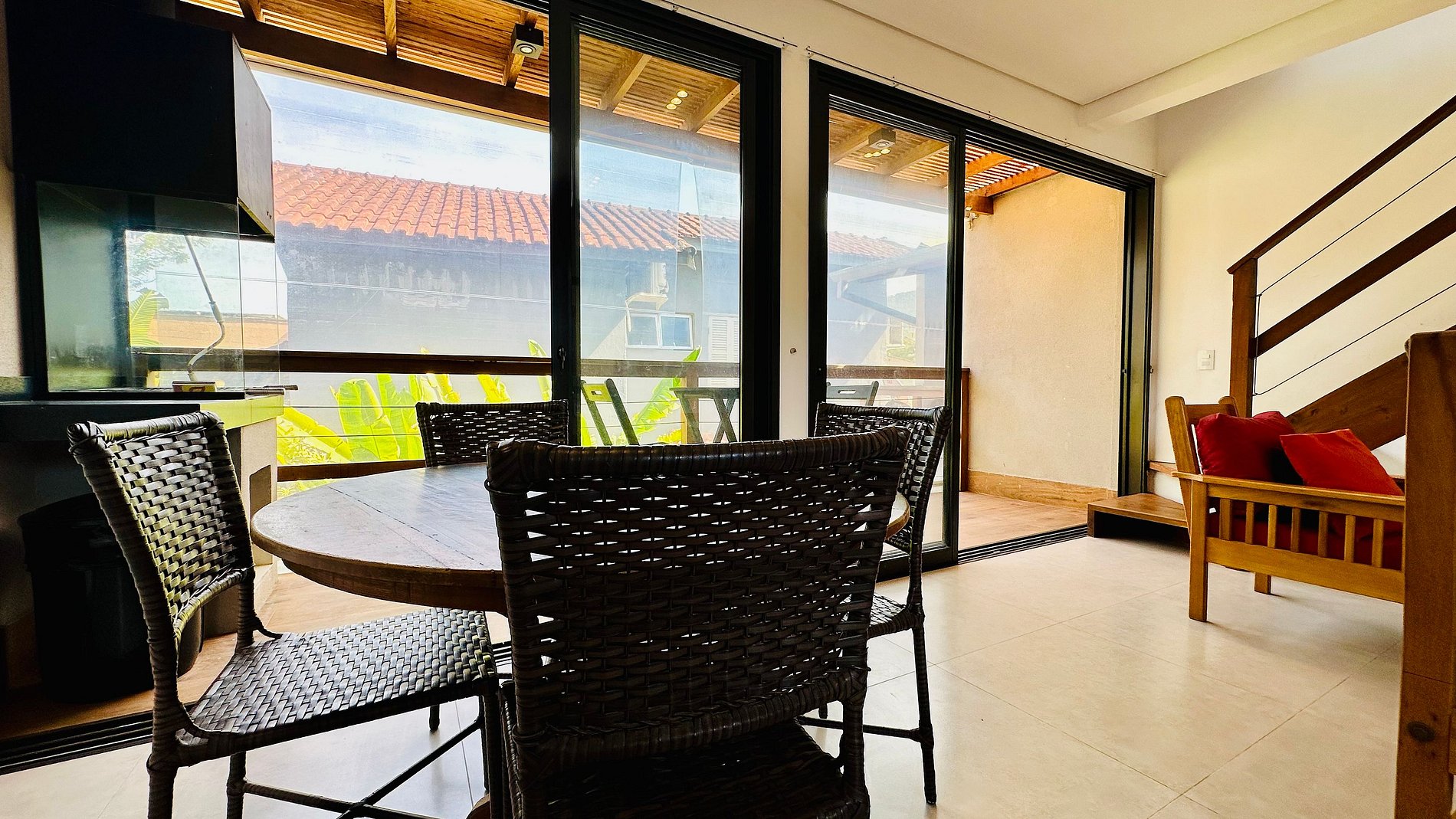 • Churrasqueira à carvão com bancada, cadeiras e mesa externa.