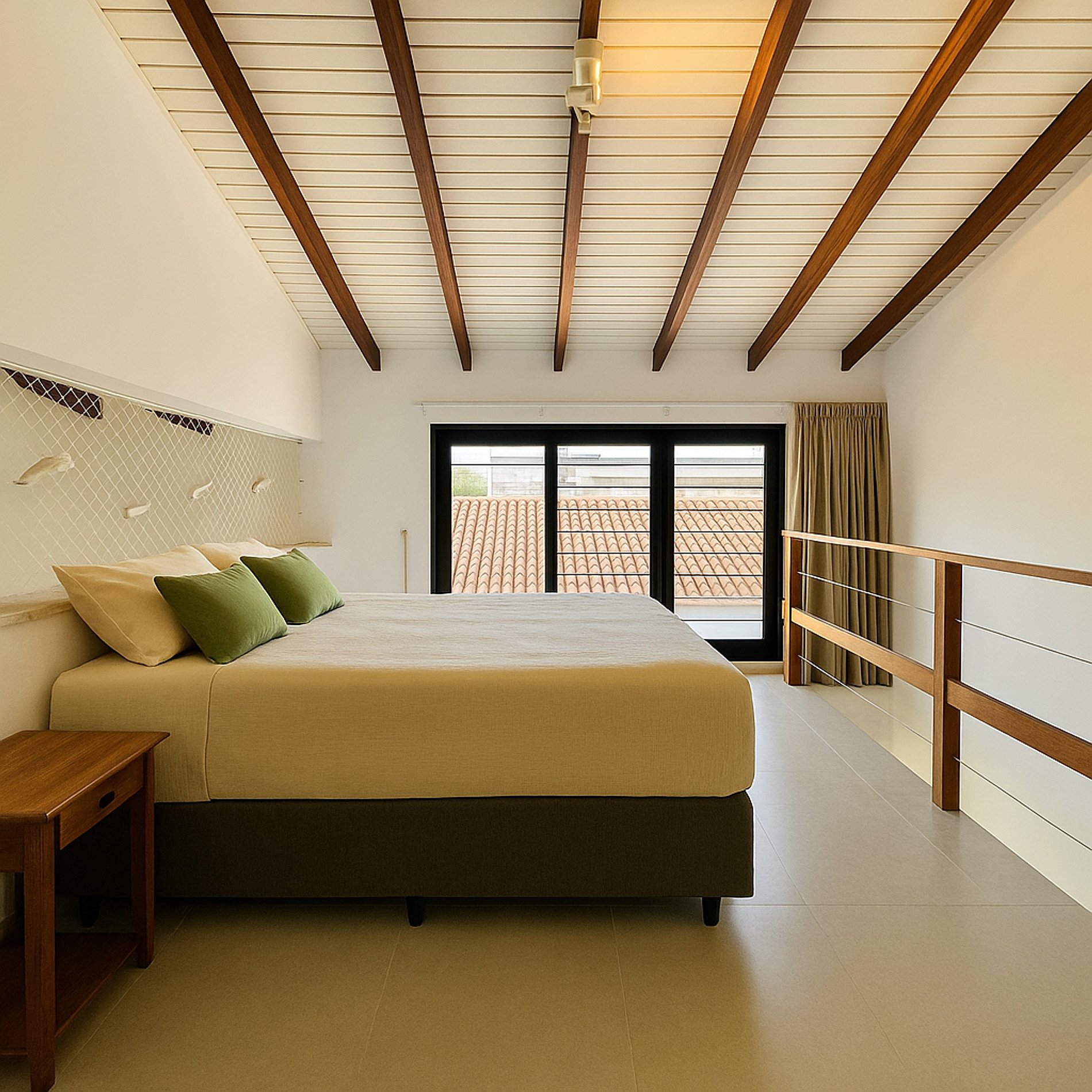 • 1 suíte climatizada com ar-condicionado split, equipada com cama queen size com travesseiros confortáveis e um colchão de solteiro.