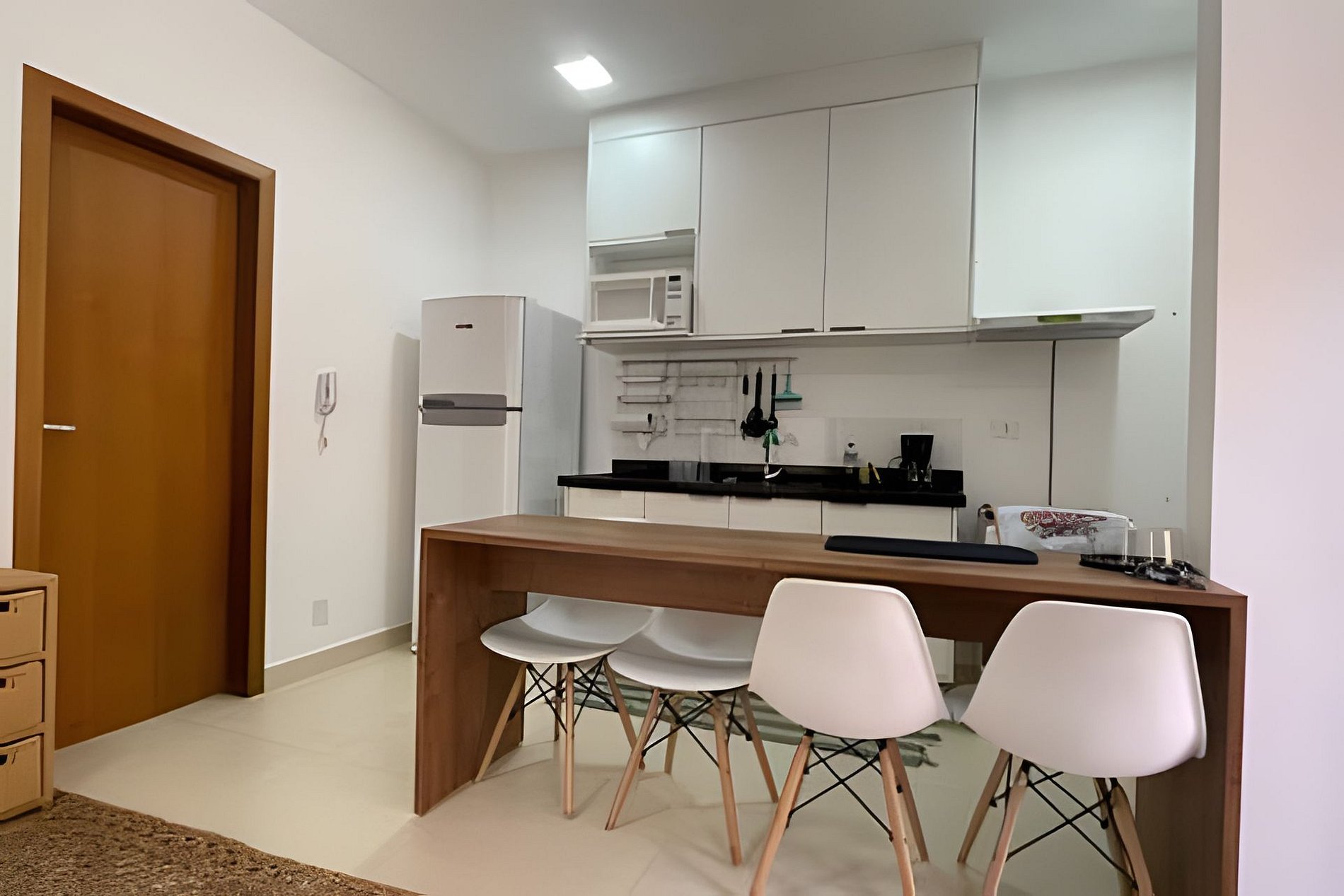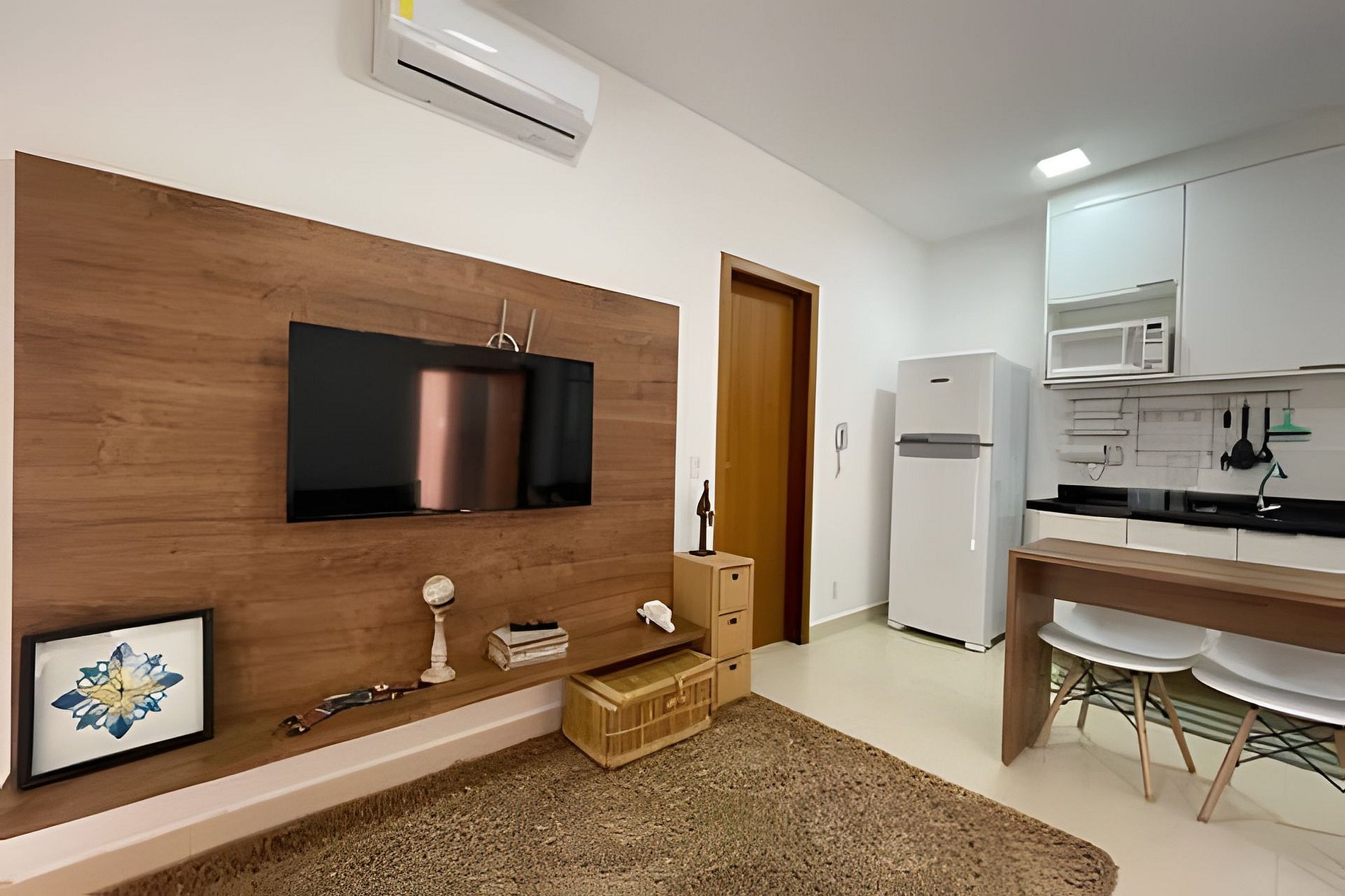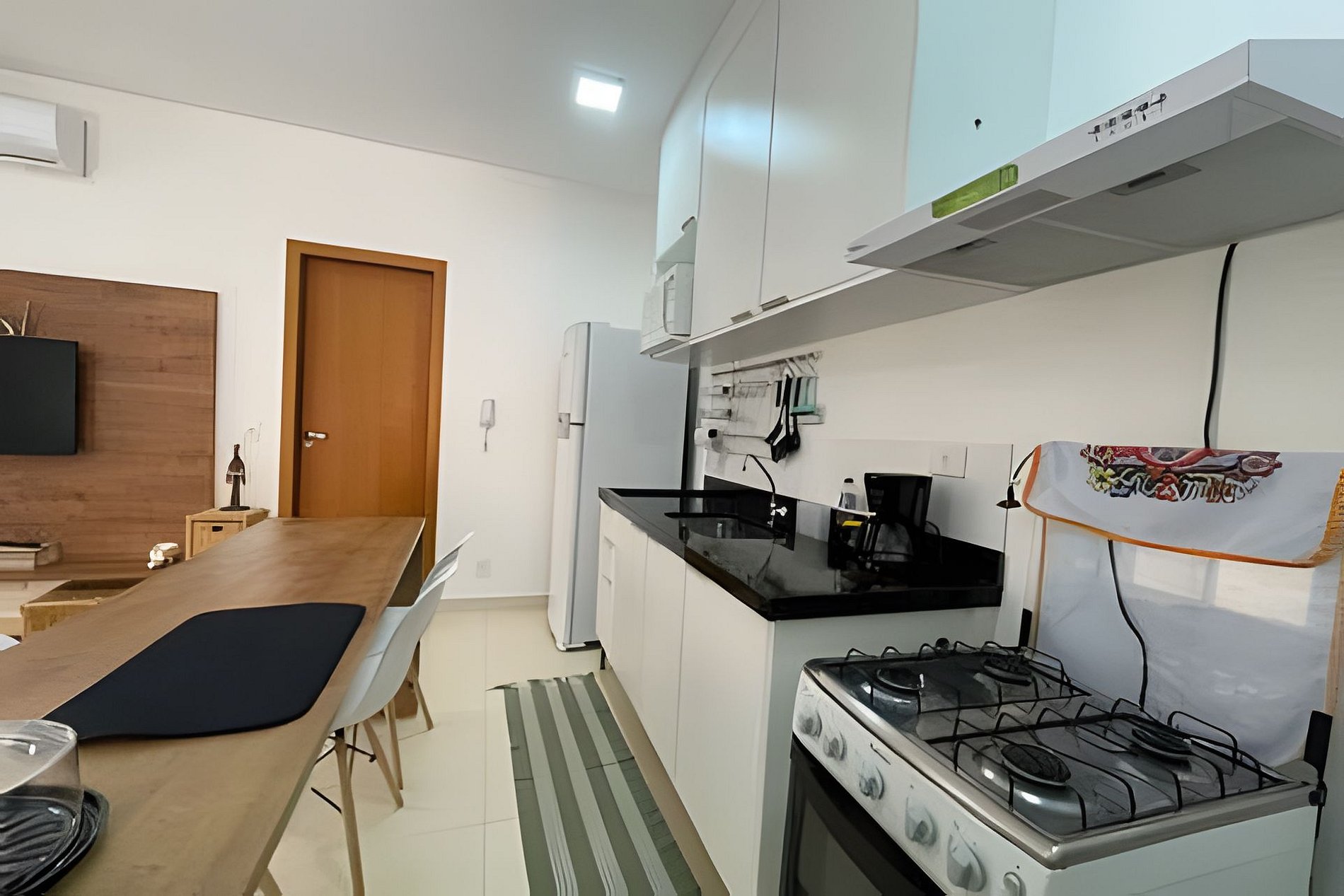 Espacio muy ventilado, sala de estar integrada con cocina americana completa. TV por cable, Wi-Fi, sofá cama muy cómodo para 2 personas. Cafeteras eléctricas, copas de vino y hermosa vajilla equipan la cocina. La suite cuenta con una cama box queen muy cómoda, un armario abierto para acomodar sus artículos personales y un amplio vestidor. El baño tiene un toallero eléctrico para facilitar el secado de sus toallas. Un espacio compacto pero muy acogedor y completo para tus días de descanso.