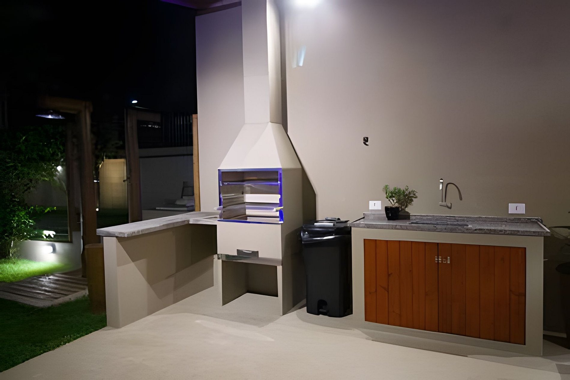 • Churrasqueira a carvão, pia de apoio, utensílios, cadeiras e mesa externa.