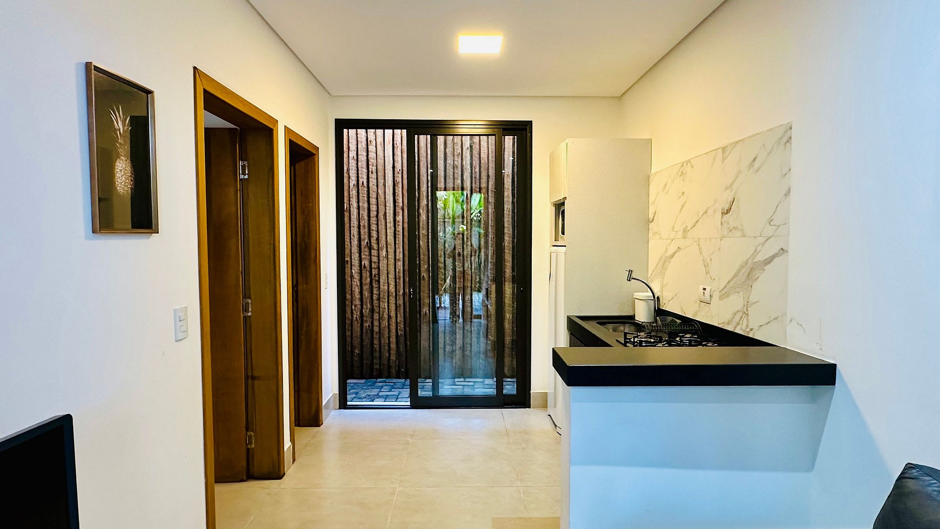 Loft em andar térreo, ideal para idosos, crianças e pessoas com dificuldade de mobilidade física. Os ambientes são integrados, o que valoriza a convivência entre os hóspedes, e ao mesmo tempo há espaço para momentos de privacidade e descanso.