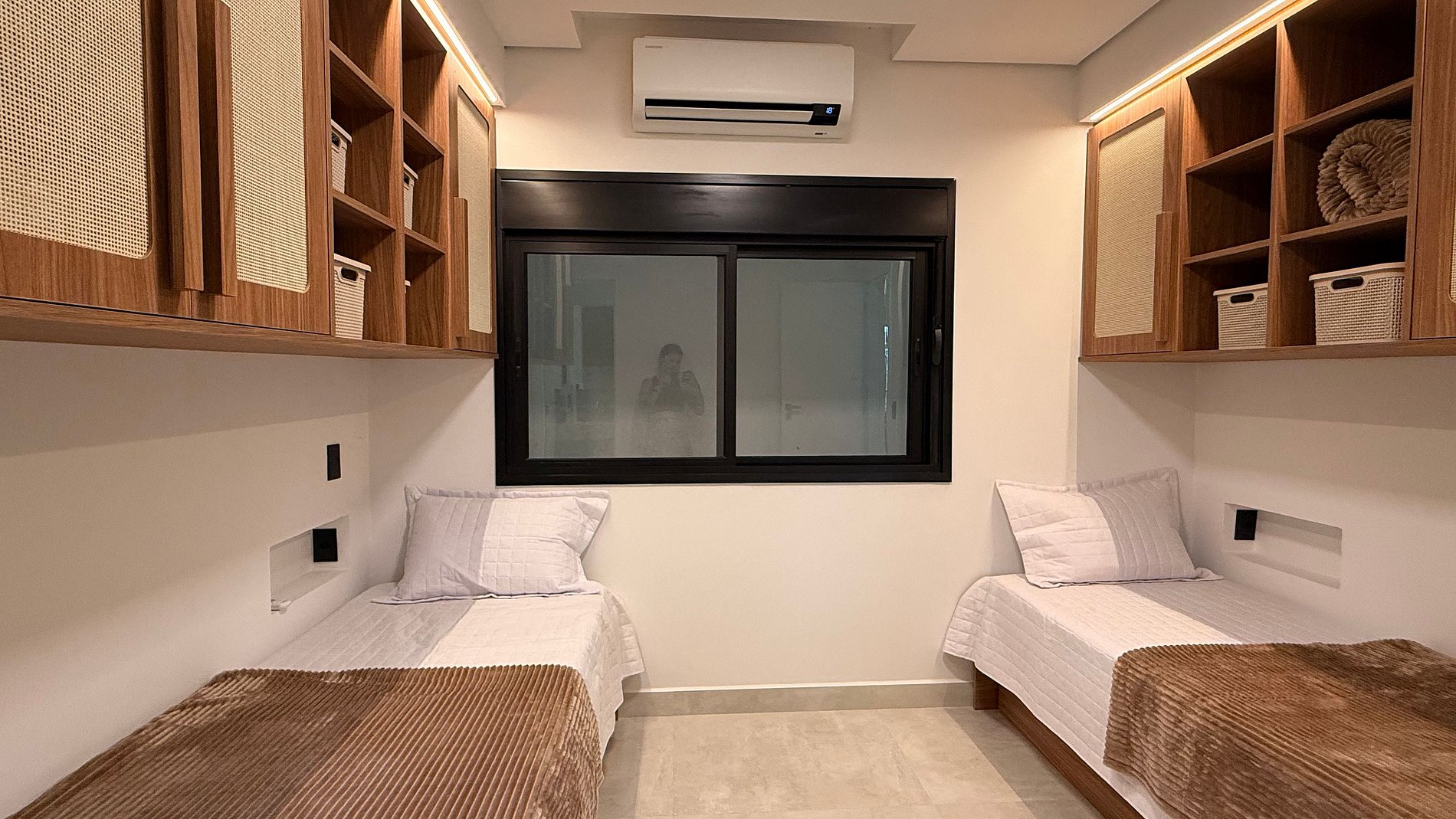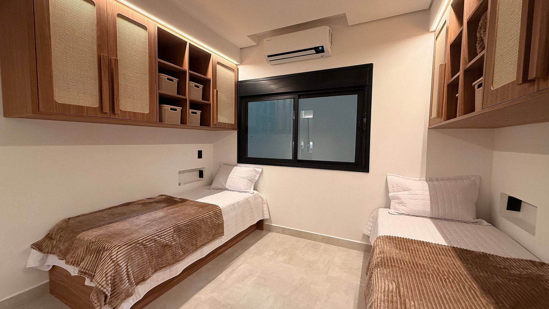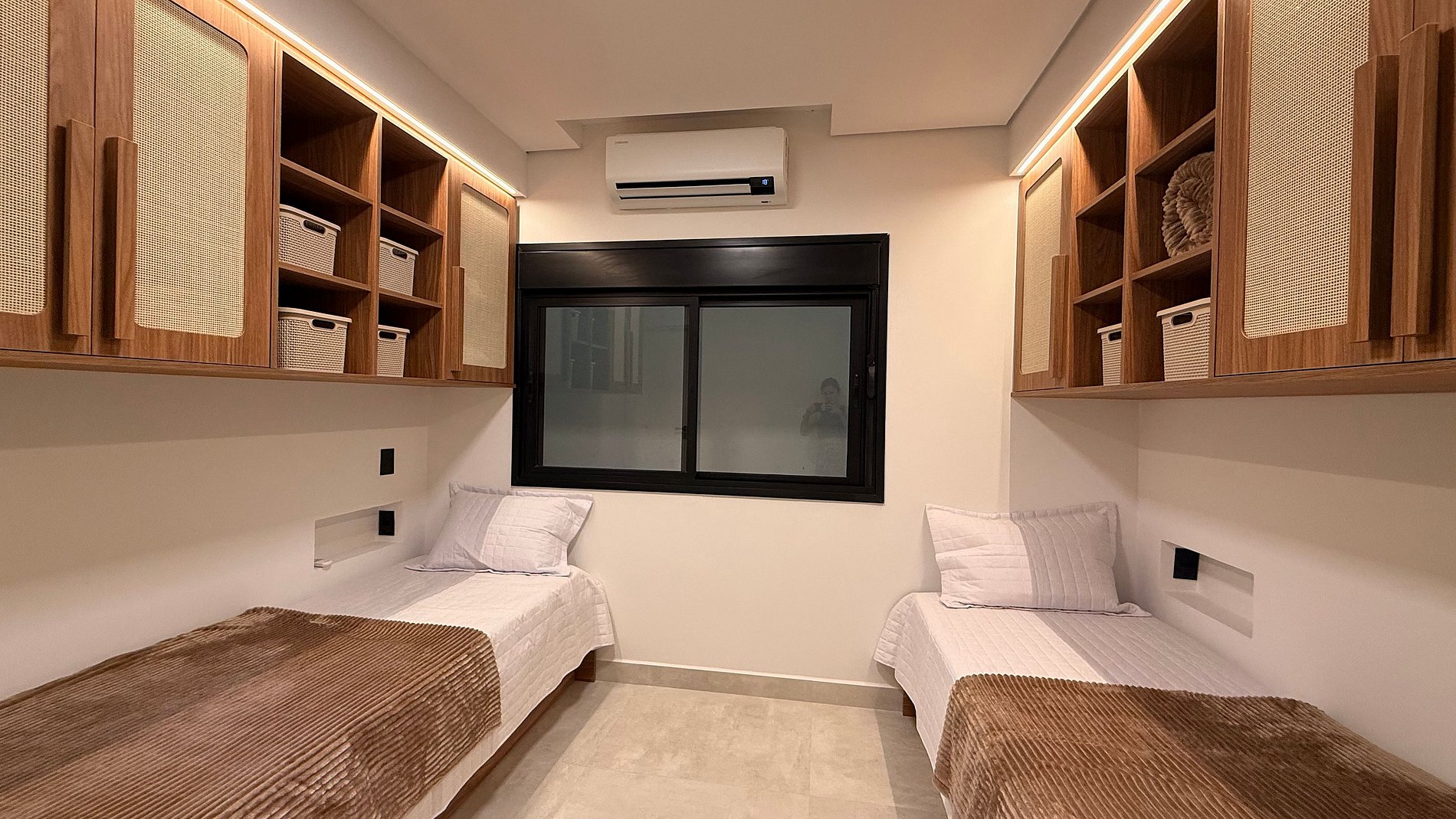 A suíte principal conta com cama queen muito confortável e ar-condicionado. A segunda suíte possui duas bicamas de solteiro, totalizando quatro camas. A casa oferece adega de vinhos, cafeteira Nespresso, sanduicheira, louçaria completa e um deck externo ideal para apreciar o pôr do sol ou fazer uma fogueira.