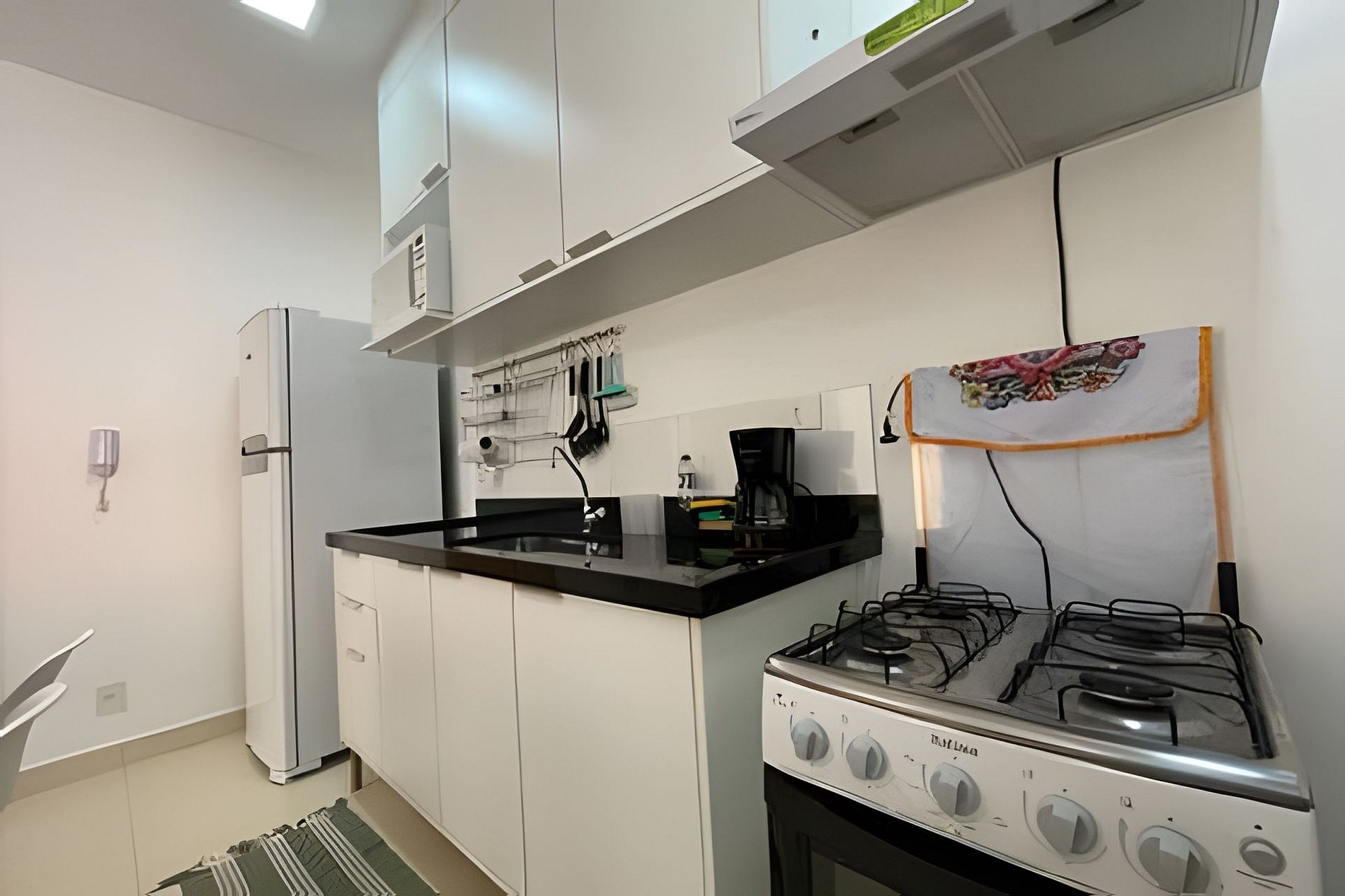 Espaço muito arejado, sala de estar integrada com cozinha americana completa. TV a cabo, Wi-Fi, sofá-cama muito confortável para 2 pessoas. Cafeteira elétrica, taças de vinho e louças lindas equipam a cozinha. A suíte tem uma cama queen box muito confortável, armário aberto para acomodar seus itens pessoais e um closet espaçoso. O banheiro tem toalheiro elétrico para facilitar a secagem das suas toalhas. Um espaço compacto, porém muito aconchegante e completo para seus dias de descanso.