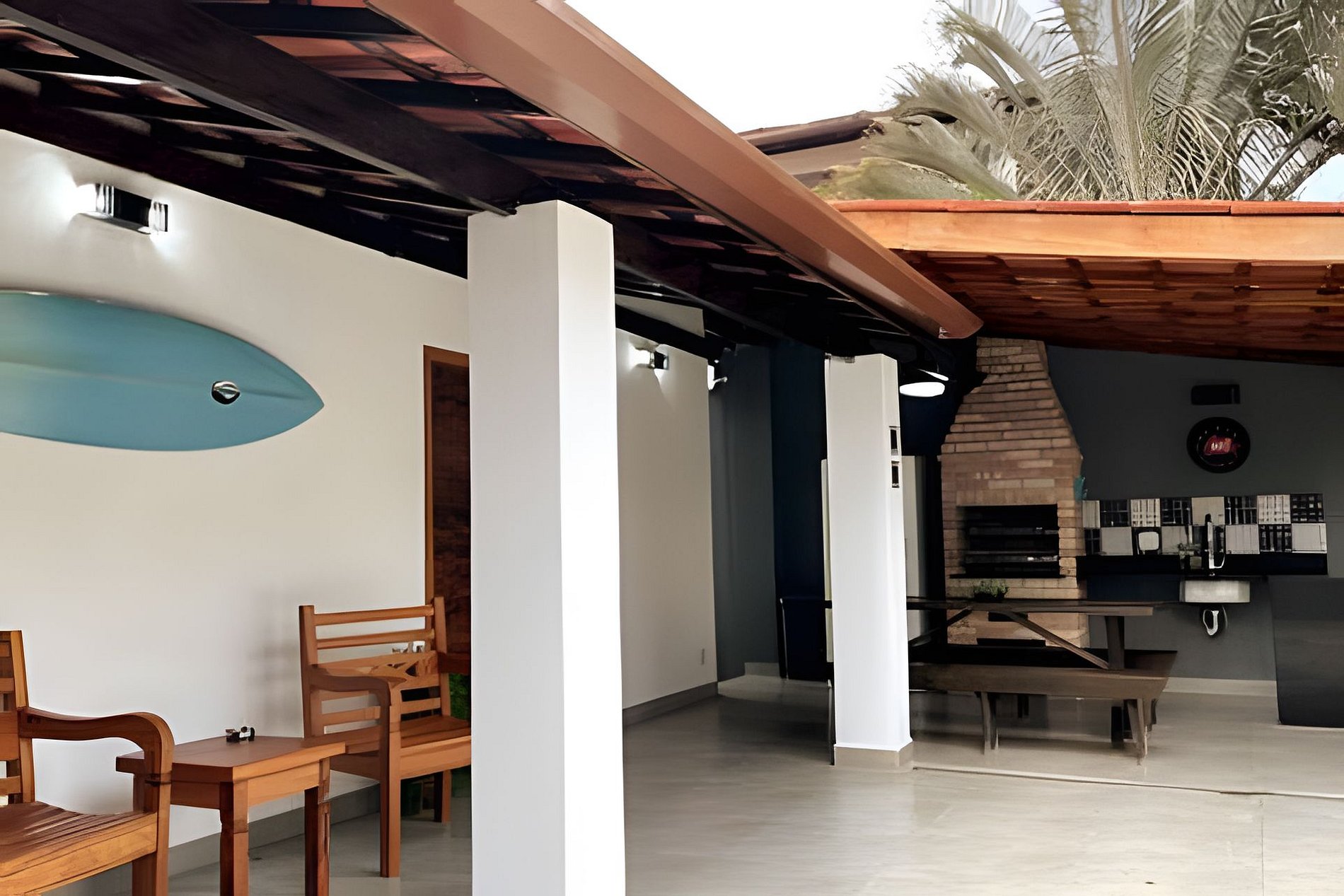 Casa composta por 7 camas, que acomodam 10 pessoas, dispostas em 3 dormitórios, sendo 1 suíte, 1 banheiro social e 1 lavabo, sala integrada com cozinha completa e varanda gourmet equipada com churrasqueira e geladeira. Ambientes climatizados com ar condicionado. A cozinha conta com geladeira, fogão, forno, micro-ondas, filtro de água, cafeteira, louças e talheres. Garagem com vagas para 2 carros. Casa ideal para famílias e grupos acima de 5 pessoas.