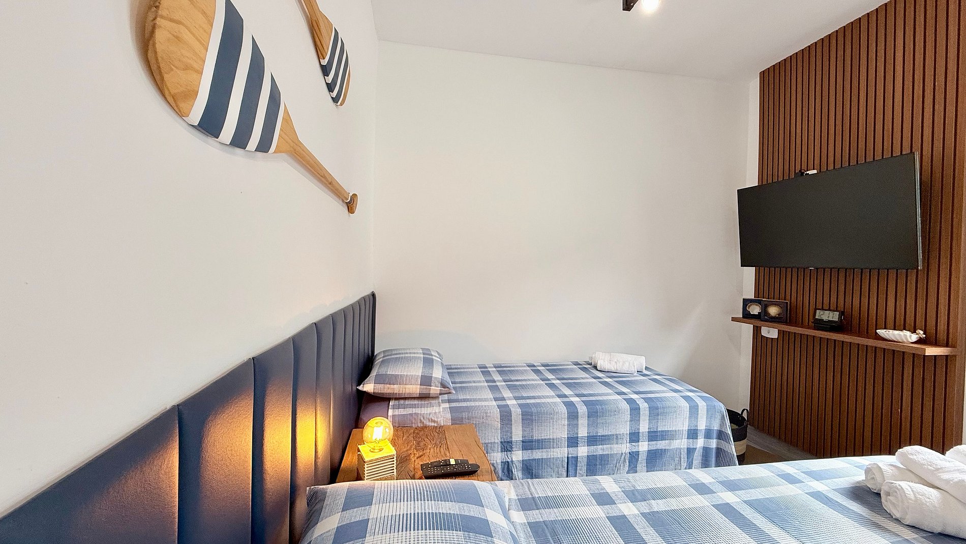 2 - A TV da sua acomodação é uma Smart TV, onde você terá acesso aos canais de streaming (Netflix, Youtube, Amazonprime e outros). Lembre-se de fazer o logout de suas contas. Além disso você terá acesso a TV a cabo SKY (canais abertos, a partir do 405);