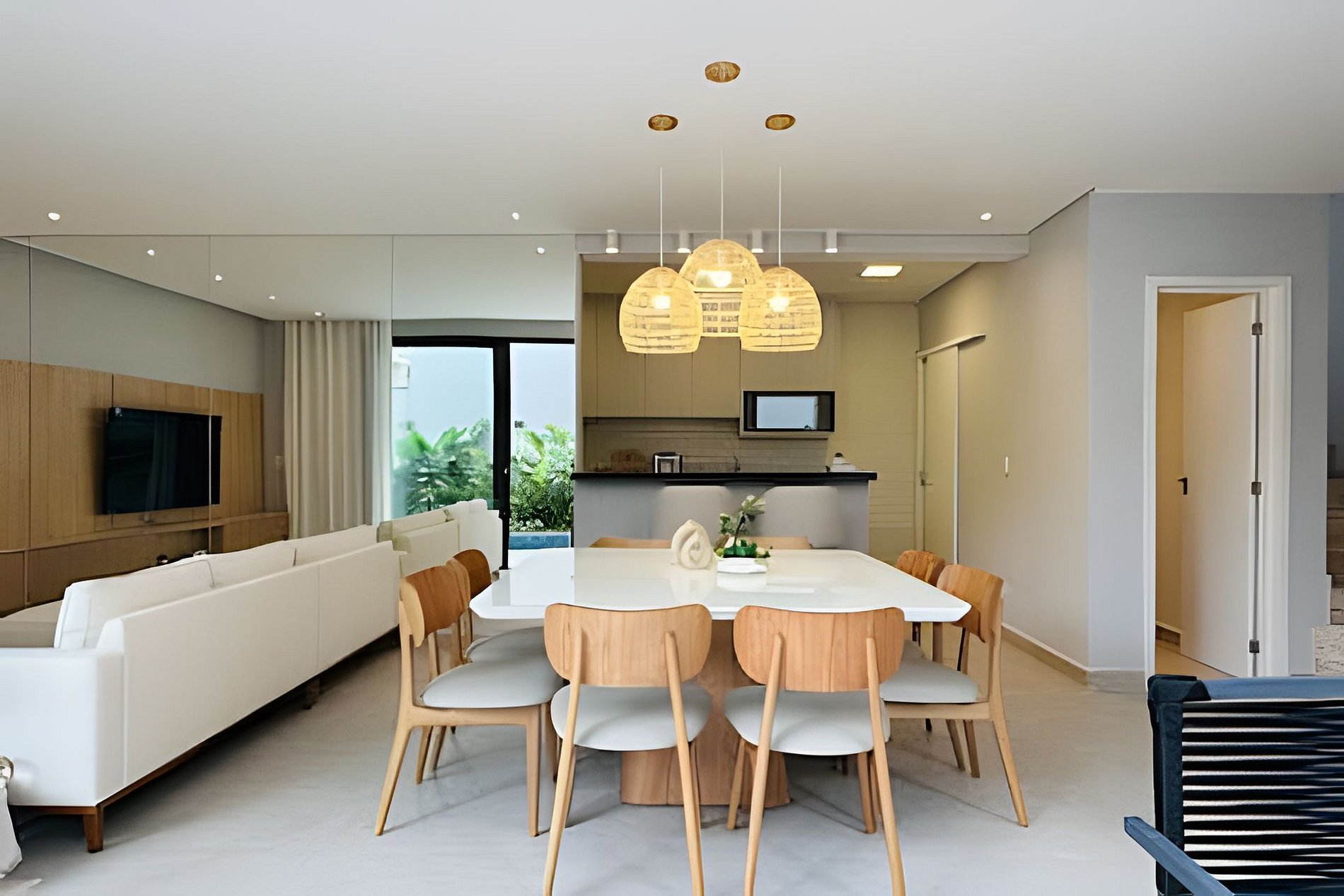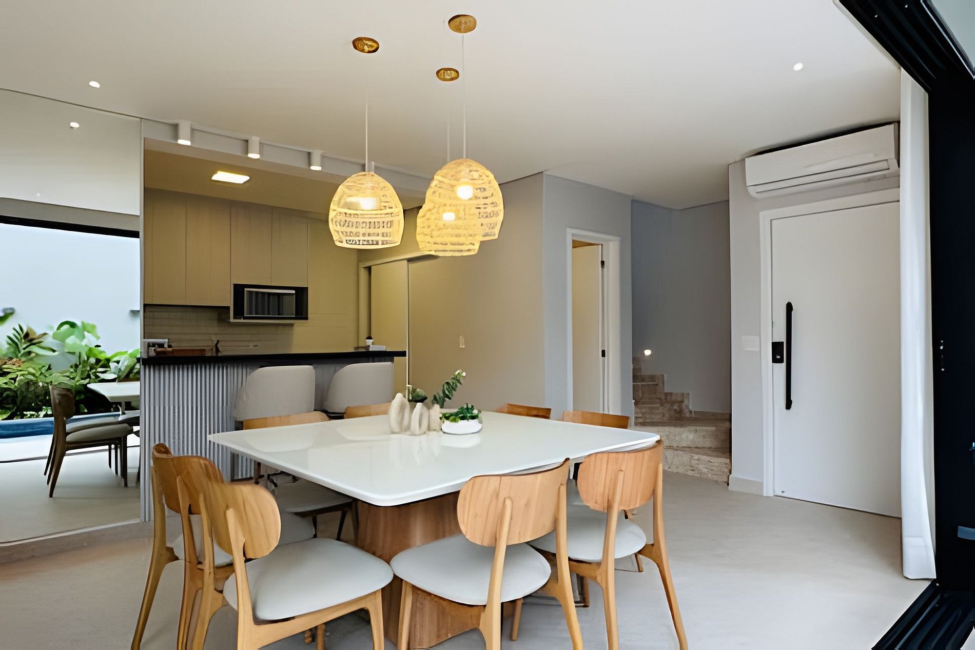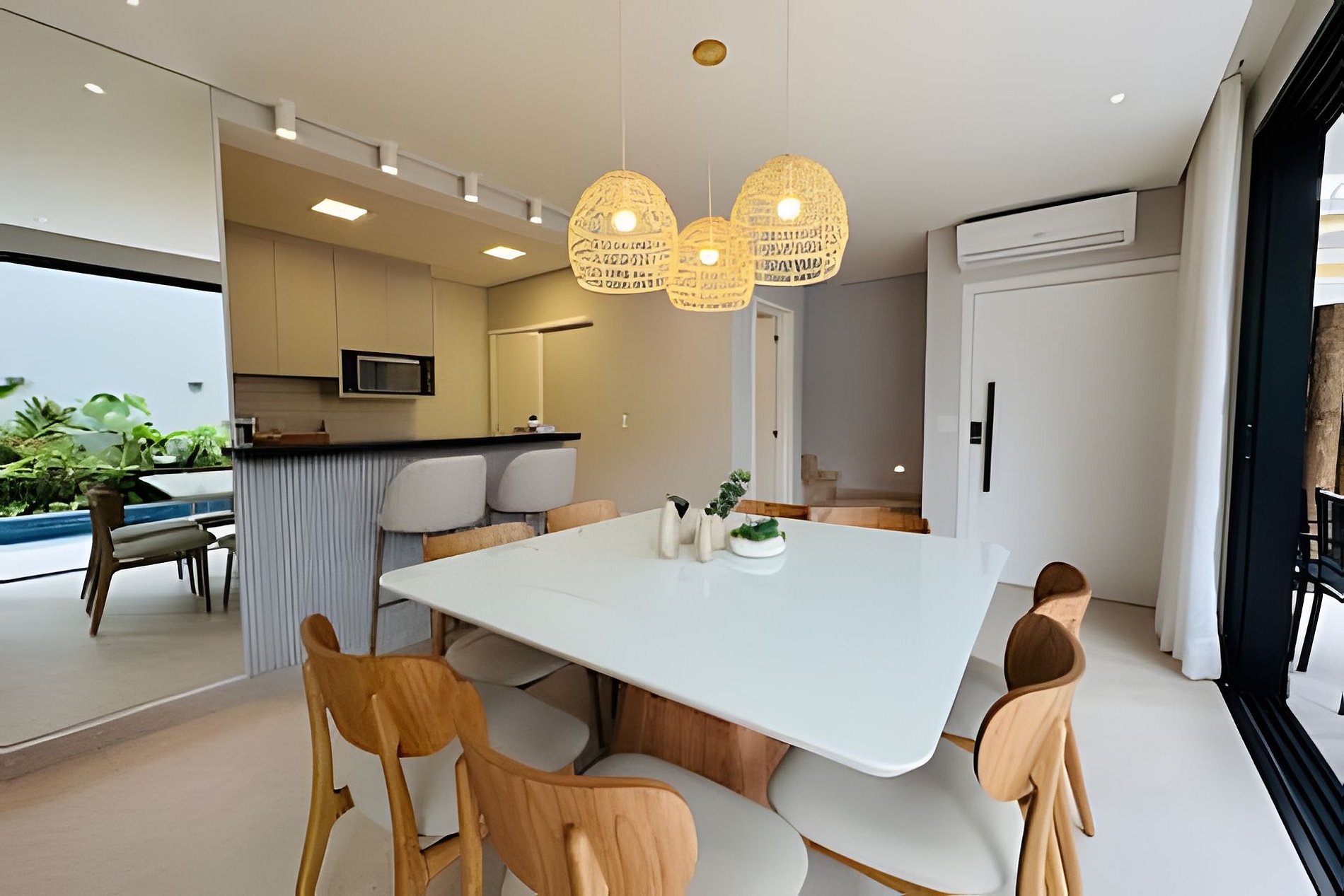 Uma acomodação do @juquehyflats. Recém construída, nunca alugada e preparada para receber famílias que priorizam conforto e integração. A piscina salinizada se integra com a sala e a churrasqueira. Dentro de um condomínio intimista com apenas 4 casas e todas com piscina privativa. Louçaria completa, roupas de cama e banho opcionais. Pertinho de tudo, do centro e da praia. Totalmente climatizada. A casa fica em condomínio com apenas 4 casas, todas com área de lazer privativas. Ao entrar na casa vc terá uma sala de estar integrada com área de jantar e cozinha completa. Na área externa e também integrada a casa tem a piscina, que é salinizada e a churrasqueira coberta por um toldo de vidro. É possível deixar a porta que divide a sala e a piscina totalmente aberta , o que proporciona muito mais espaço. No segundo piso temos 2 suítes com sala de banho e duchas bem fortes. As suítes tem ar condicionado e janelas blackout. E no terceiro andar a suíte master, também com sala de banho e varanda. Os nossos hóspedes tem acesso a toda área comum do condomínio e a casa toda.