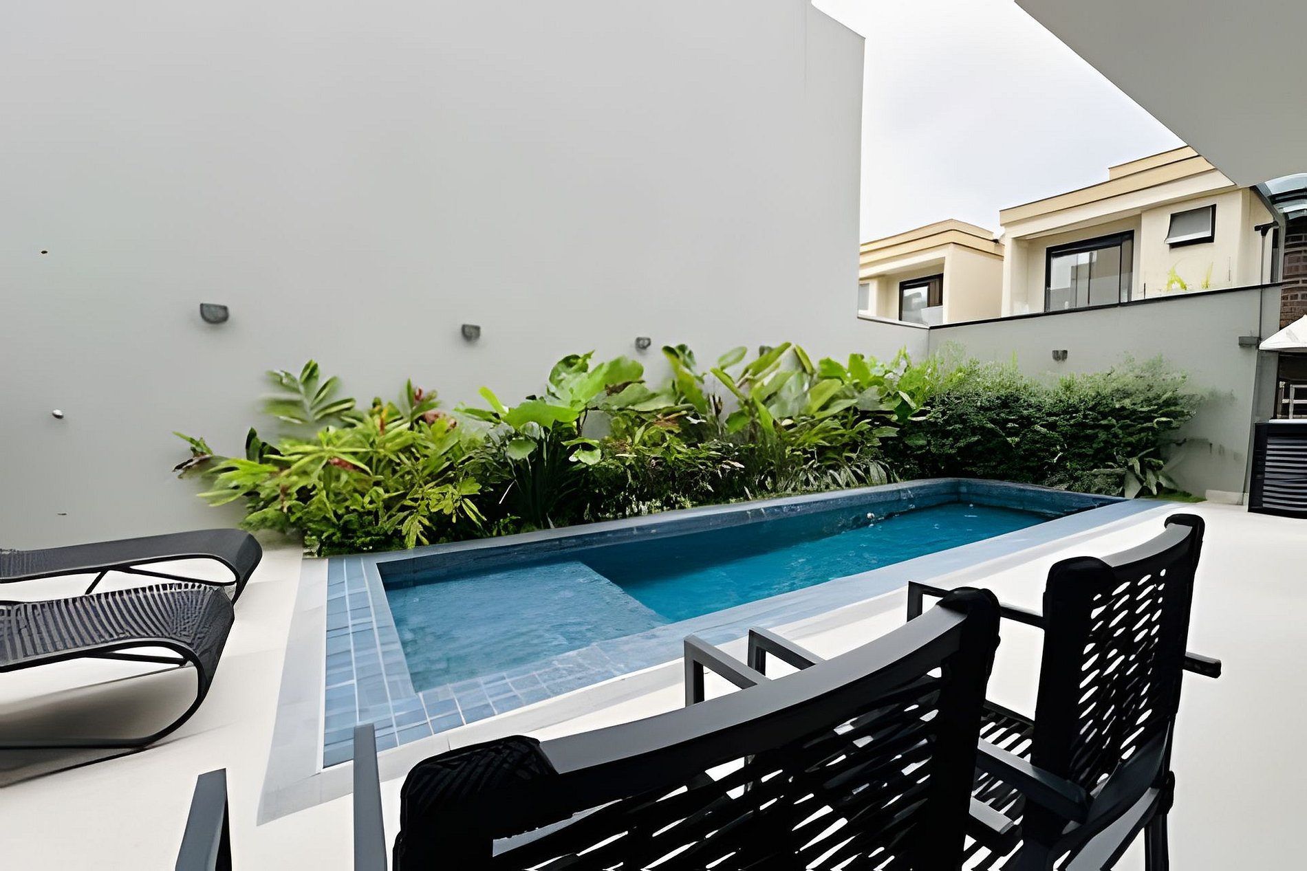 A casa fica em condomínio com apenas 4 casas, todas com área de lazer privativas. Ao entrar na casa vc terá uma sala de estar integrada com área de jantar e cozinha completa. Na área externa e também integrada a casa tem a piscina, que é salinizada e a churrasqueira coberta por um toldo de vidro. É possível deixar a porta que divide a sala e a piscina totalmente aberta , o que proporciona muito mais espaço. No segundo piso temos 2 suítes com sala de banho e duchas bem fortes. As suítes tem ar condicionado e janelas blackout. E no terceiro andar a suíte master, também com sala de banho e varanda.
