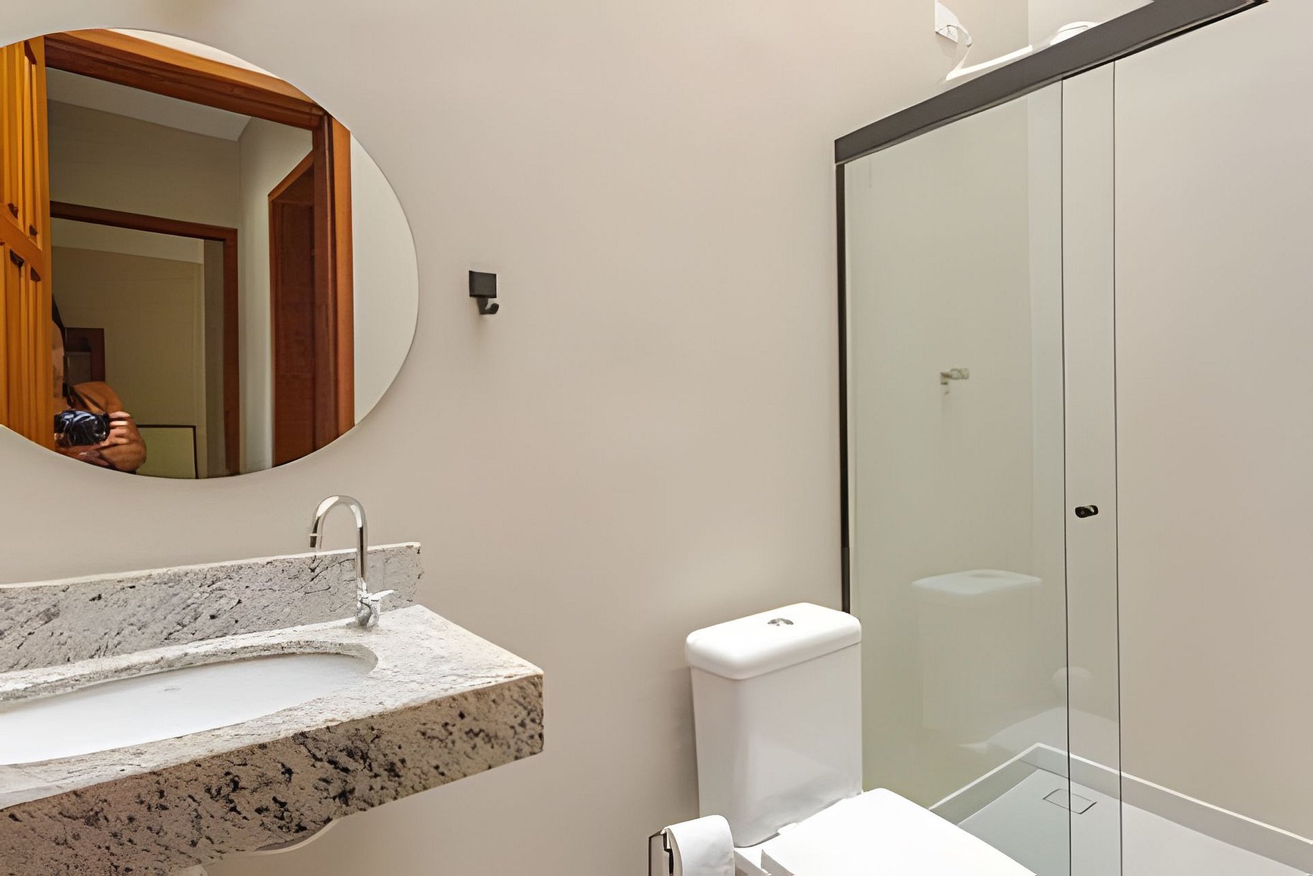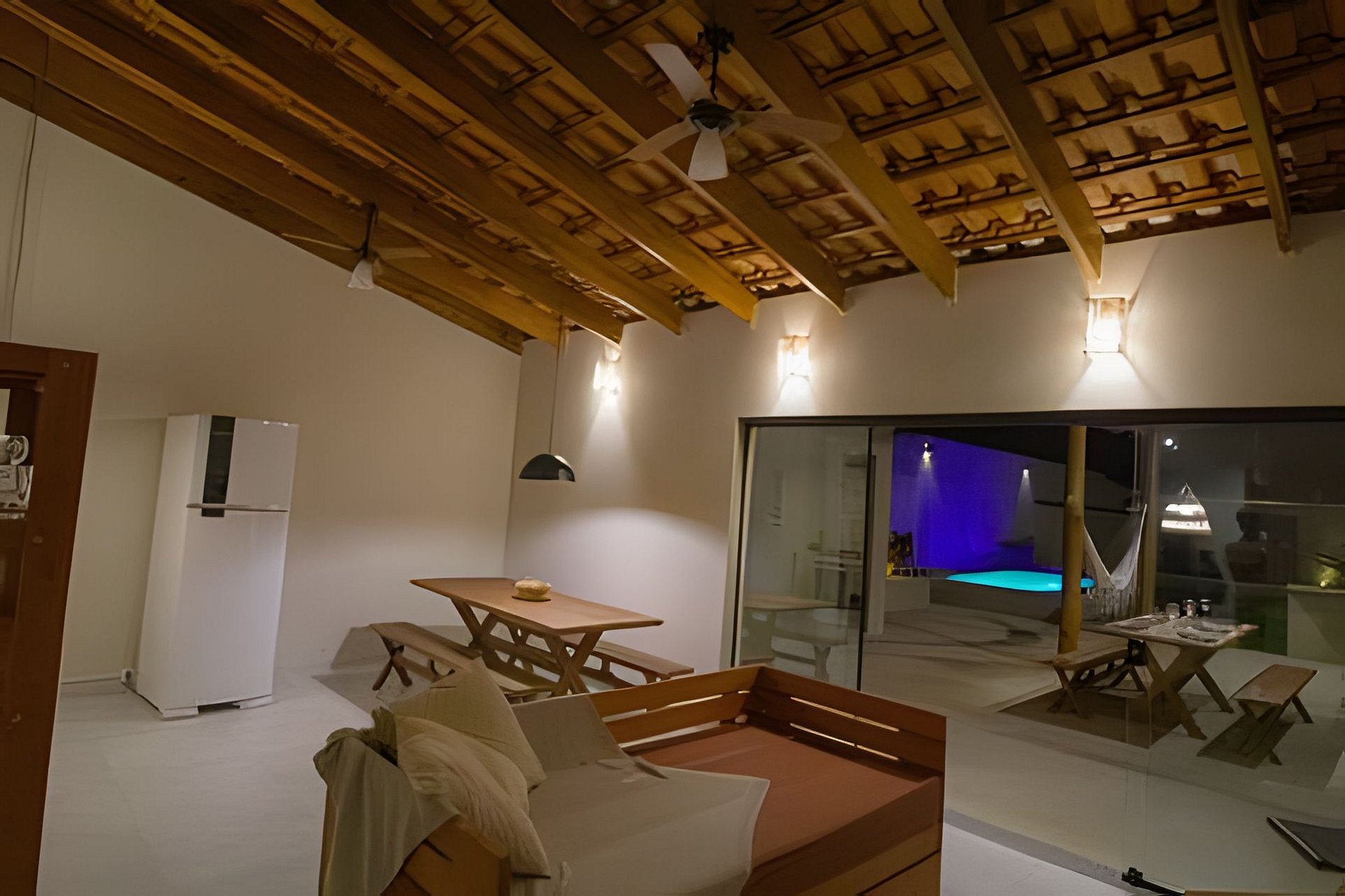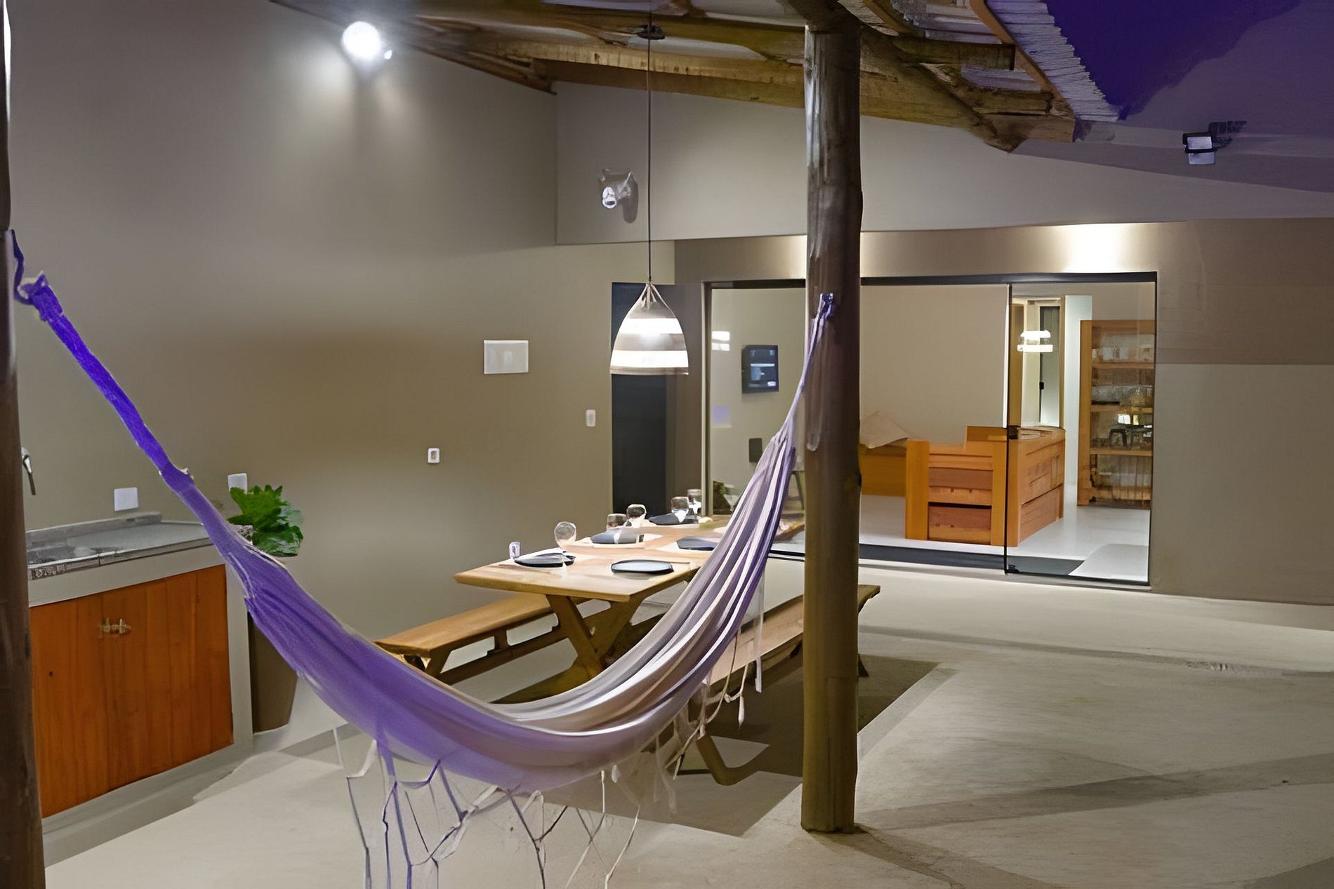 A casa é ampla, arejada, banheiros com pé-direito alto, proporcionando sensação de amplitude e sofisticação. Os ambientes são integrados, o que valoriza a convivência entre os hóspedes, e ao mesmo tempo há espaço para momentos de privacidade e descanso.