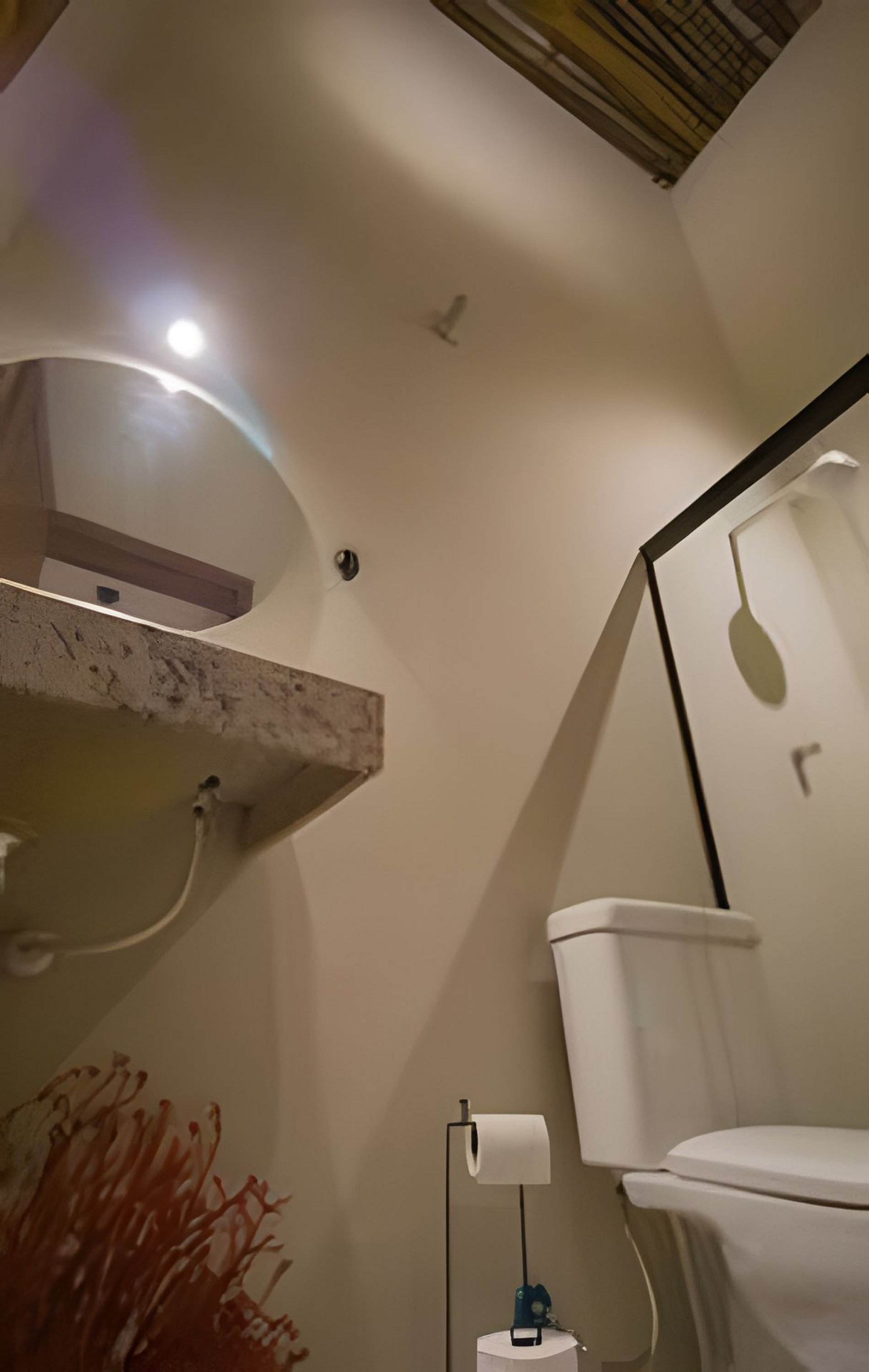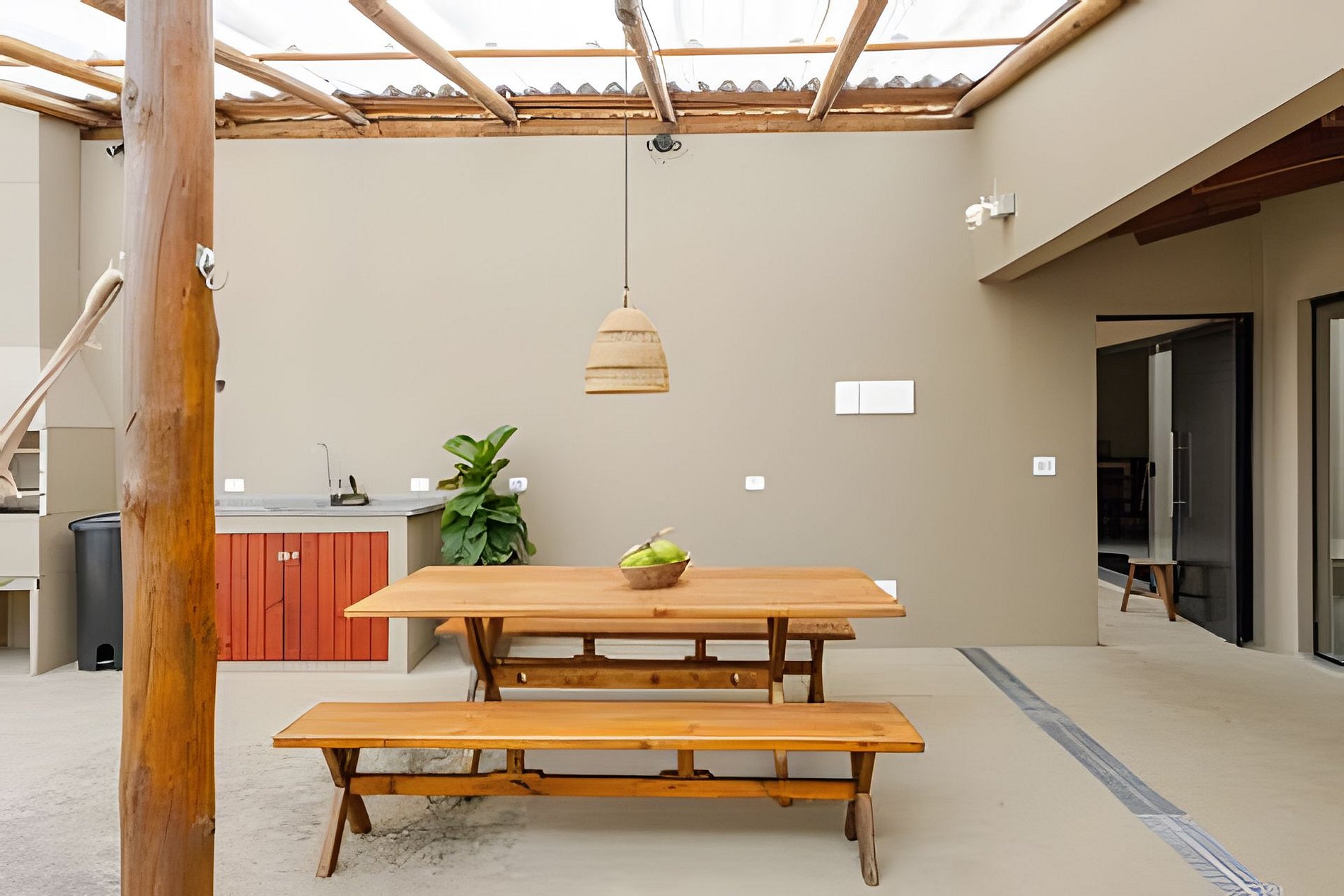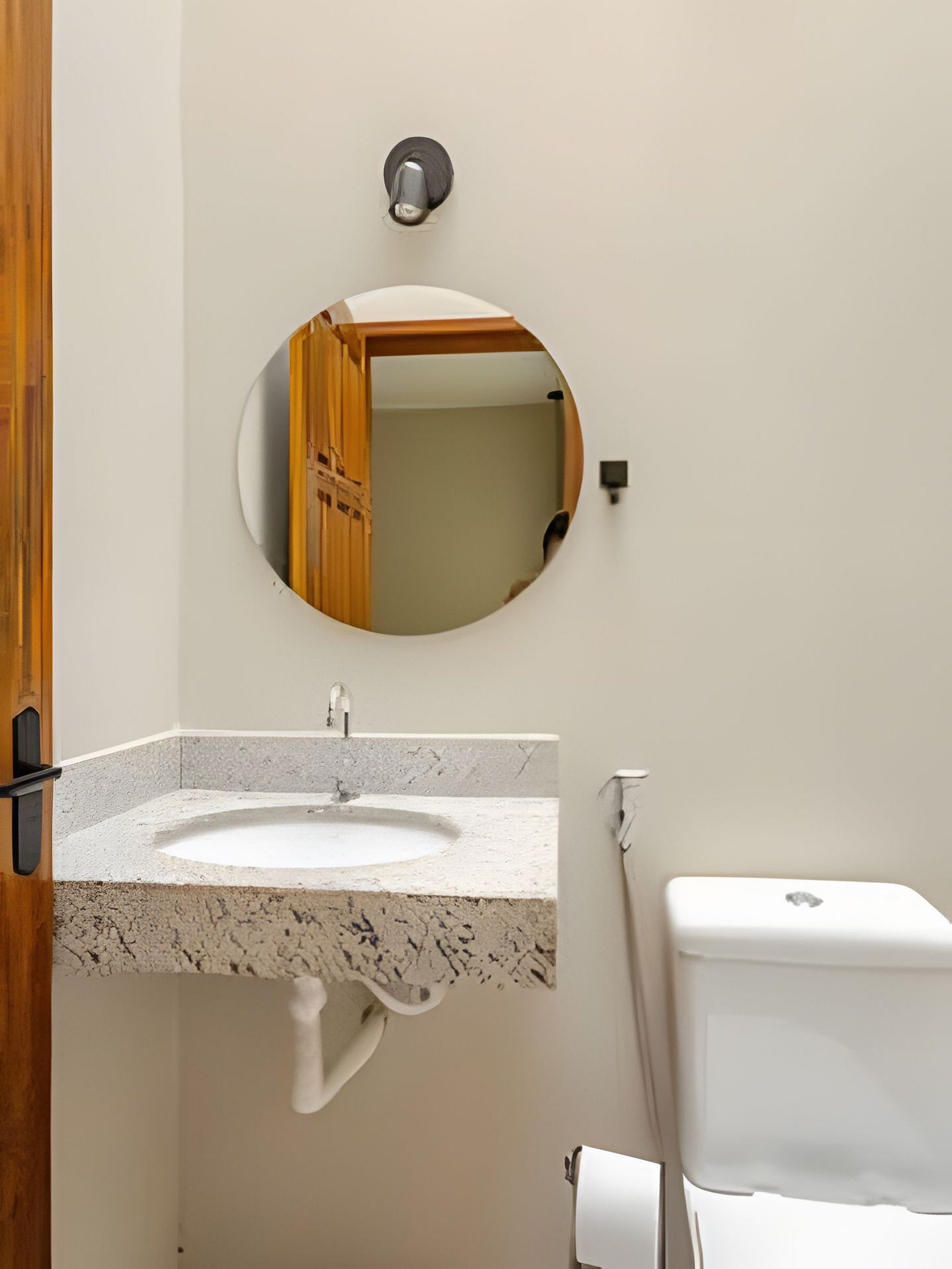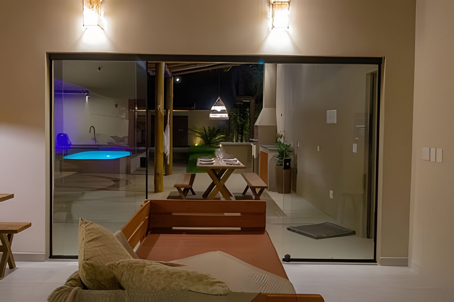 A casa é ampla, arejada, banheiros com pé-direito alto, proporcionando sensação de amplitude e sofisticação. Os ambientes são integrados, o que valoriza a convivência entre os hóspedes, e ao mesmo tempo há espaço para momentos de privacidade e descanso.