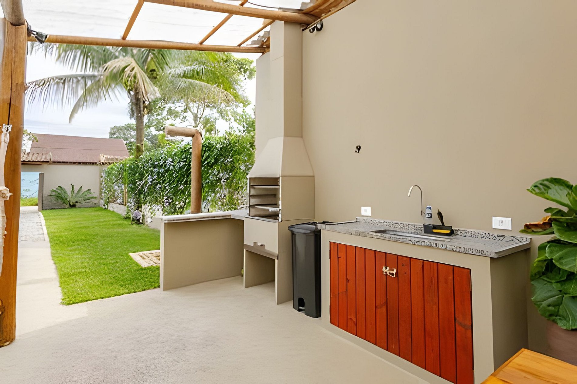 • Churrasqueira a carvão, pia de apoio, utensílios, cadeiras e mesa externa.