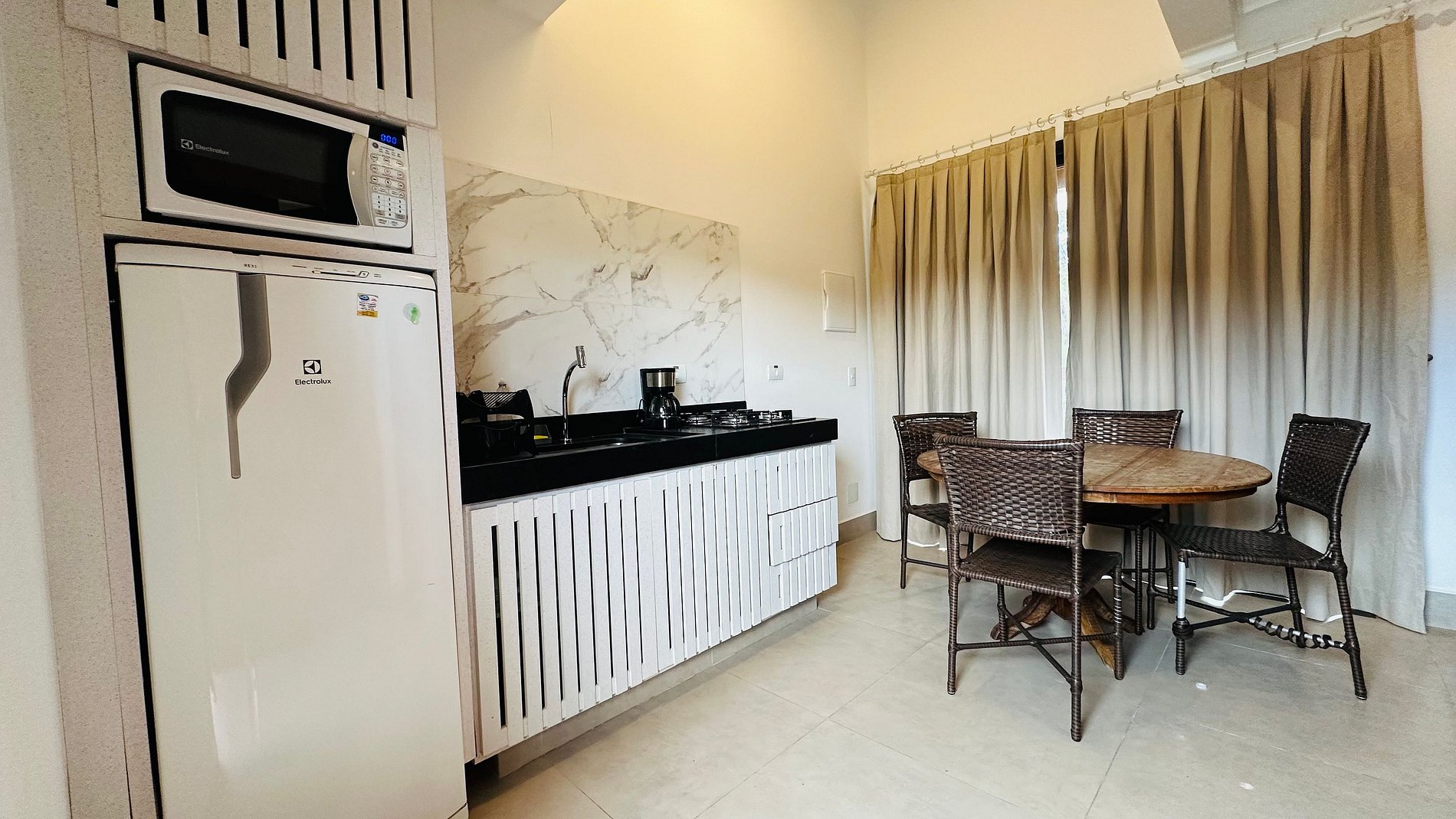 • Cozinha integrada, equipada com geladeira, cooktop, micro-ondas, cafeteira elétrica, utensílios de cozinha e louças para todas as refeições.