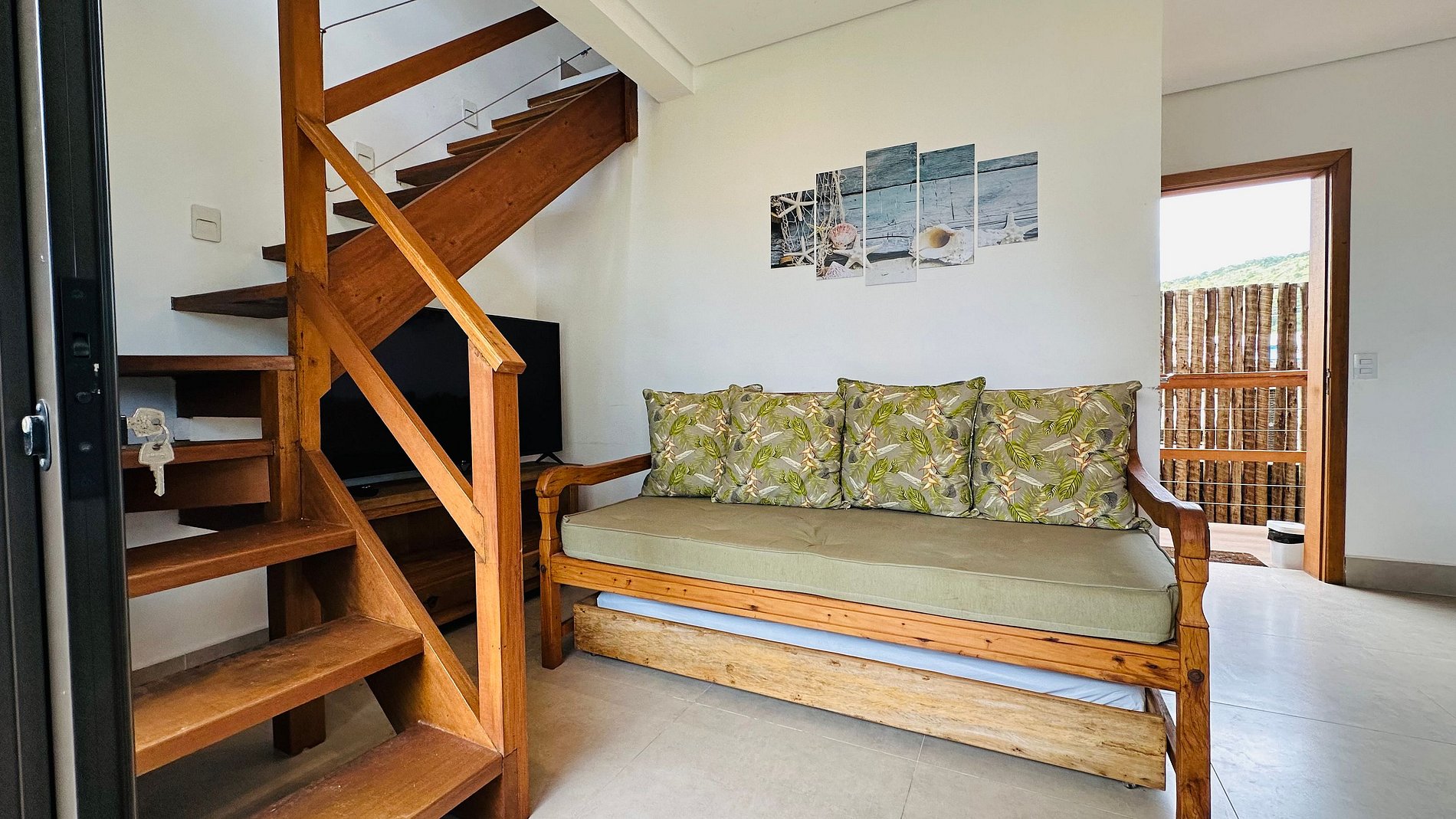 Loft duplex com pé-direito alto, proporcionando sensação de amplitude e sofisticação. Os ambientes são integrados, o que valoriza a convivência entre os hóspedes, e ao mesmo tempo há espaço para momentos de privacidade e descanso.