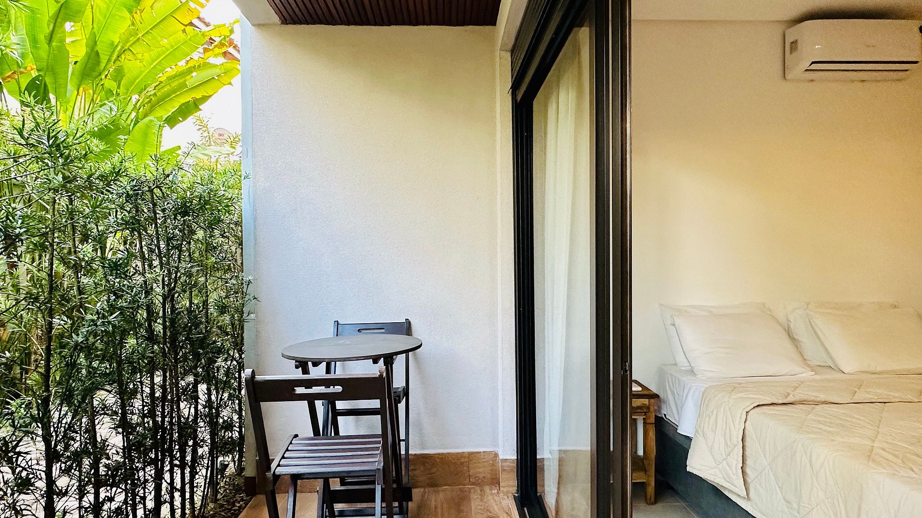 • 1 quarto com porta automatizada, que da acesso a varanda da acomodação, ar-condicionado split, com cama queen size com travesseiros confortáveis e um colchão de solteiro.