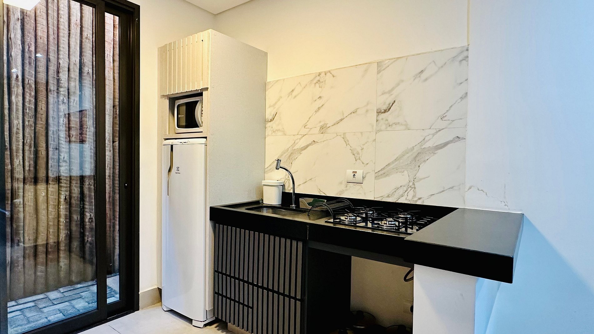 Loft em andar térreo, ideal para idosos, crianças e pessoas com dificuldade de mobilidade física. Os ambientes são integrados, o que valoriza a convivência entre os hóspedes, e ao mesmo tempo há espaço para momentos de privacidade e descanso.