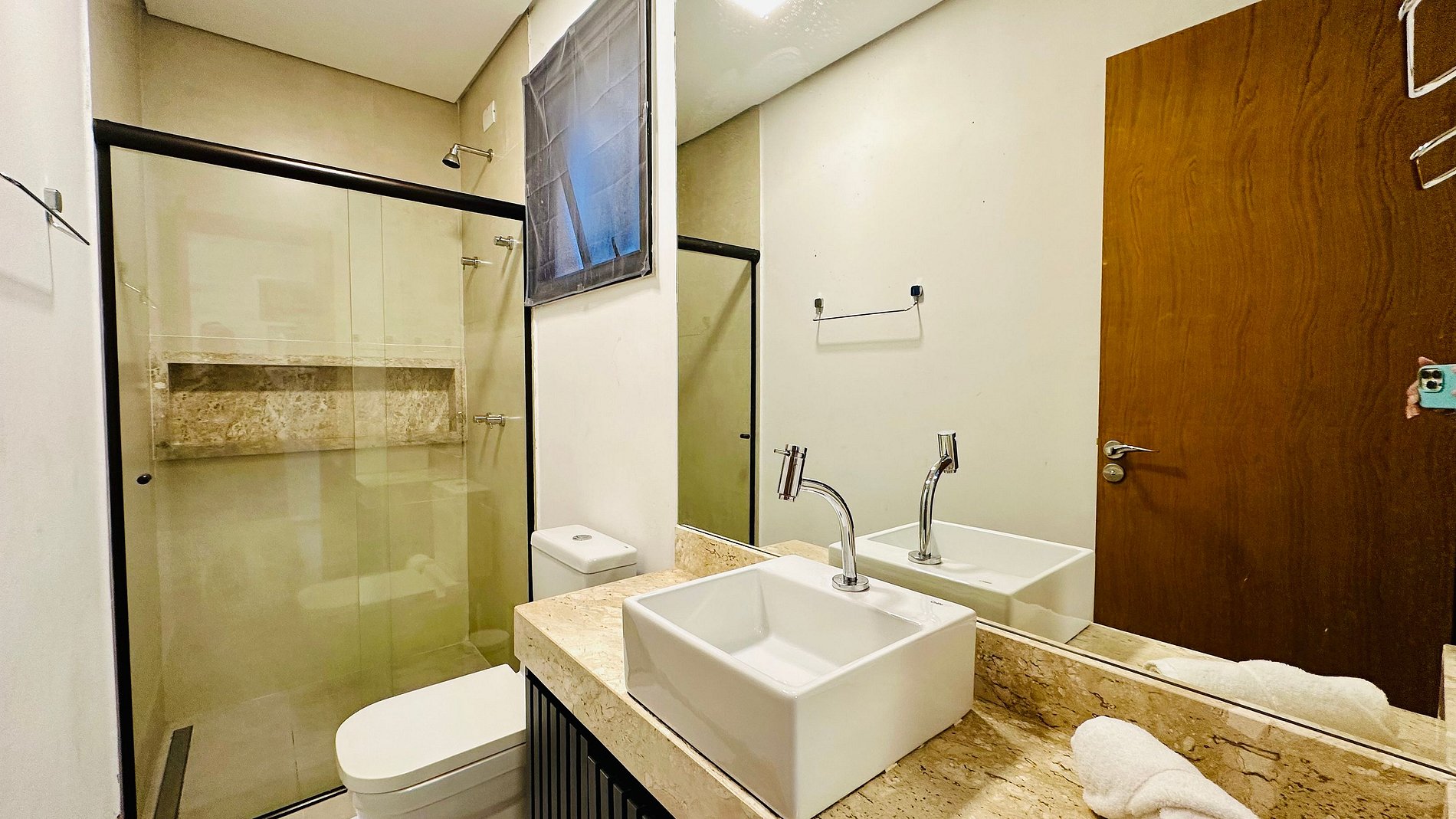 • Os banheiro é bem espaçoso, com box de vidro, ducha Deca pressurizada, toalhas de banho disponíveis, exceto toalhas de praia.