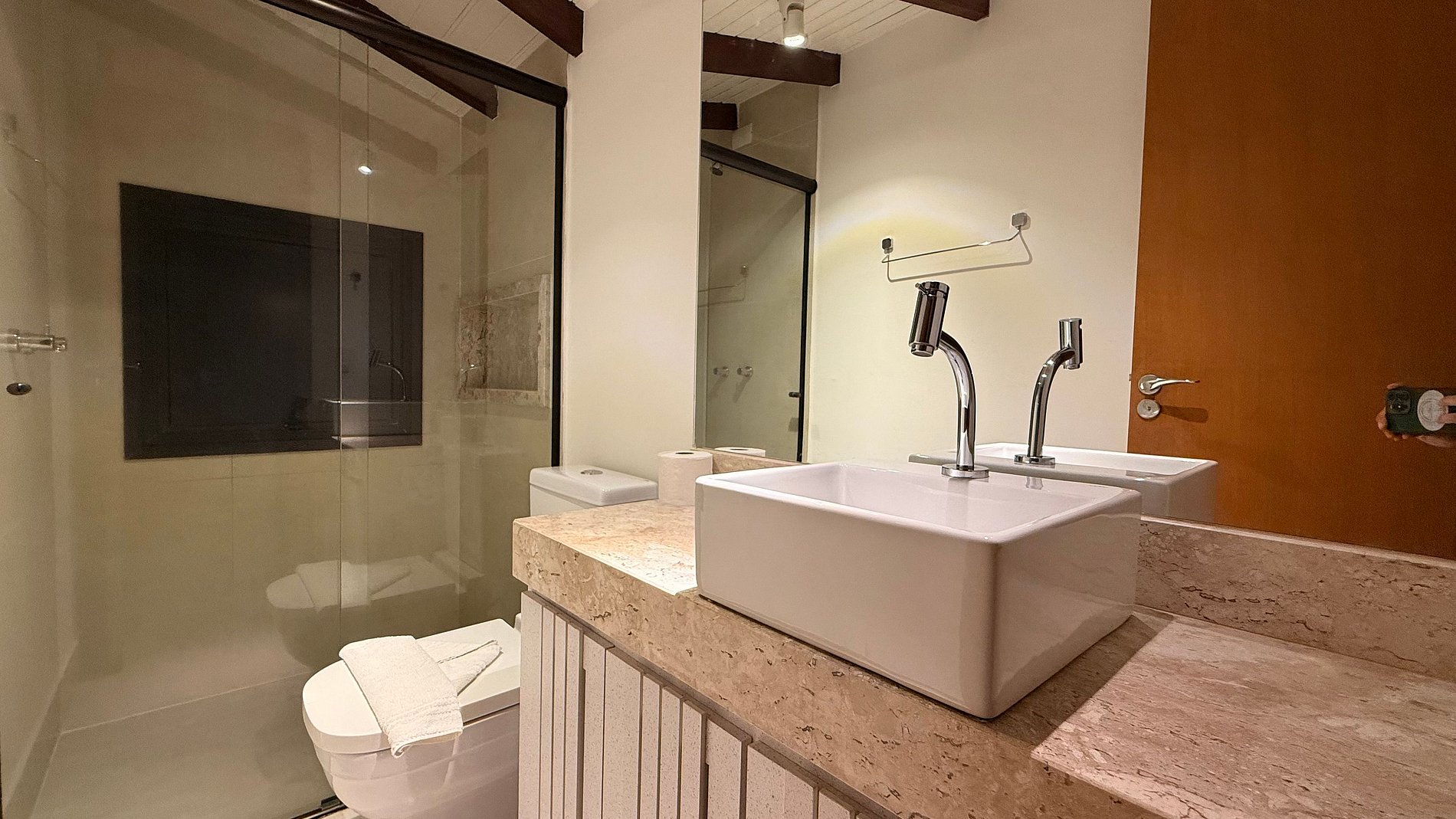 • Os banheiros são espaçosos, com box de vidro, duchas pressurizadas, toalhas de banho disponíveis, exceto toalhas de praia.