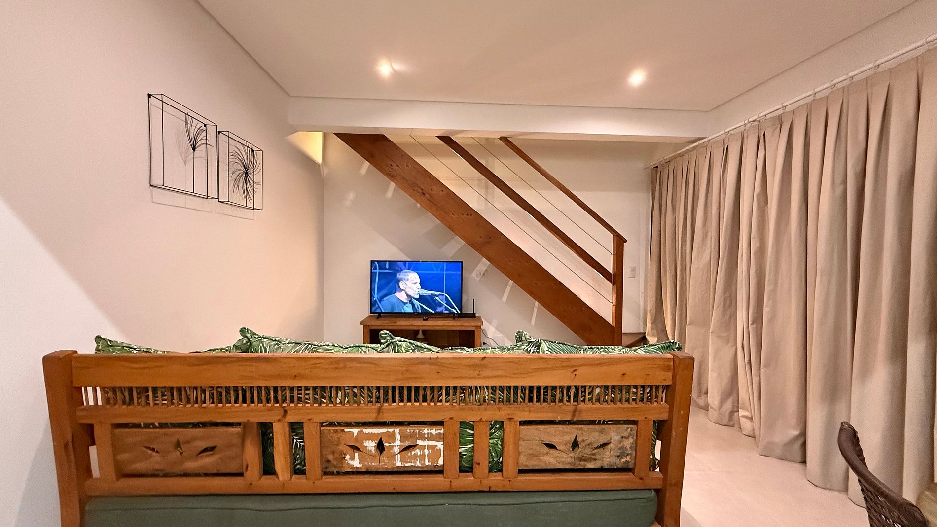 Loft duplex com pé-direito alto, proporcionando sensação de amplitude e sofisticação. Os ambientes são integrados, o que valoriza a convivência entre os hóspedes, e ao mesmo tempo há espaço para momentos de privacidade e descanso.