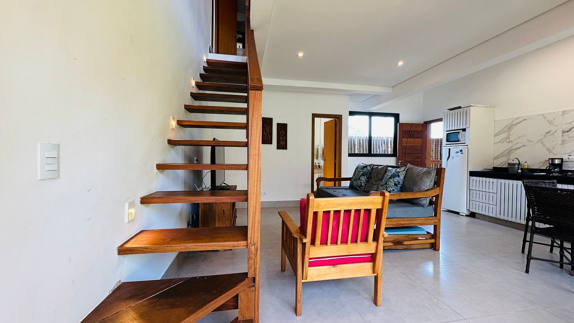 Loft duplex com pé-direito alto, proporcionando sensação de amplitude e sofisticação. Os ambientes são integrados, o que valoriza a convivência entre os hóspedes, e ao mesmo tempo há espaço para momentos de privacidade e descanso.