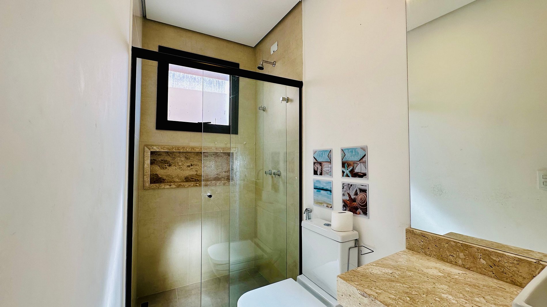 • Os banheiros são espaçosos, com box de vidro, duchas pressurizadas, toalhas de banho disponíveis, exceto toalhas de praia.