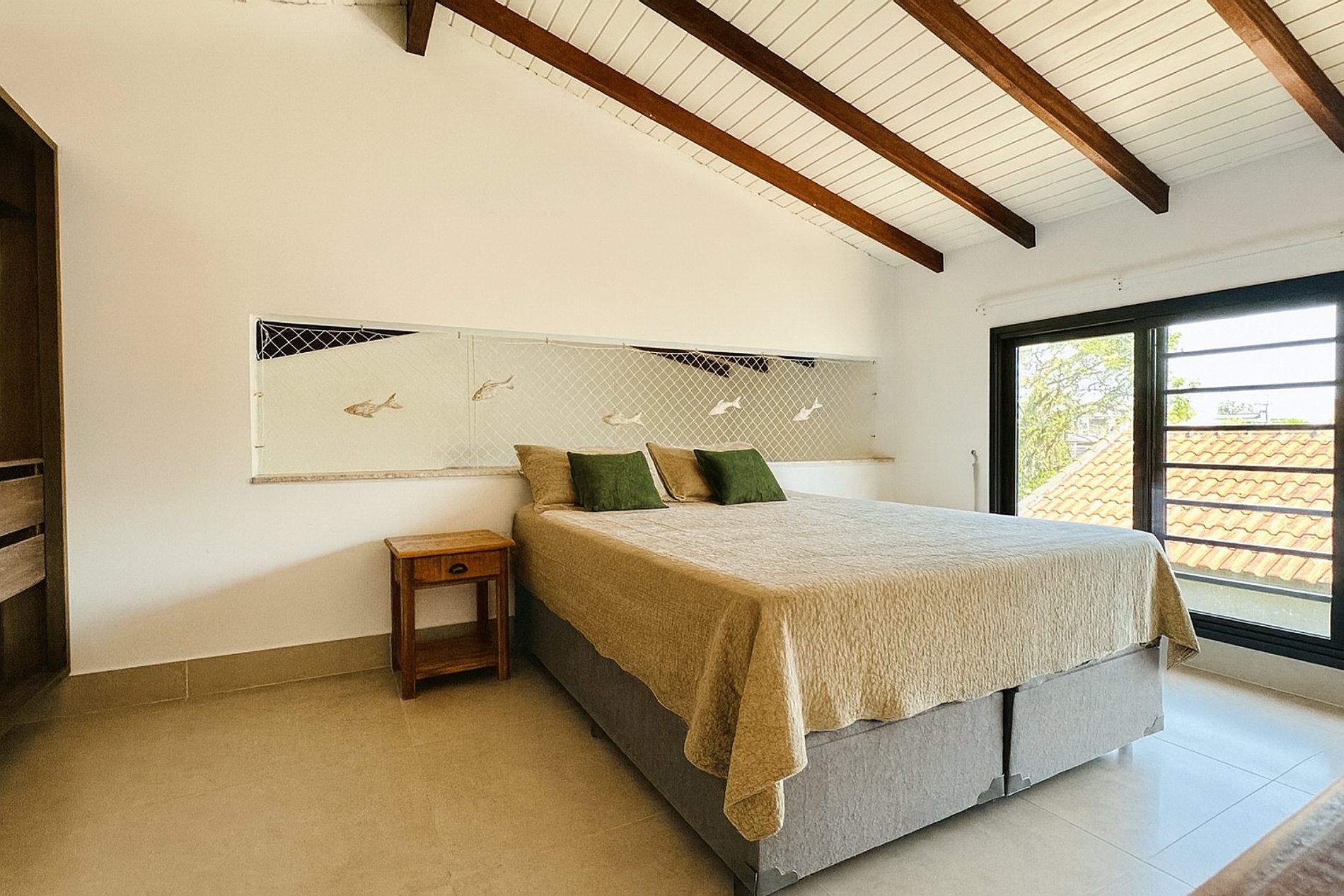 • 1 suíte climatizada com ar-condicionado split, equipada com cama queen size com travesseiros confortáveis e um colchão de solteiro.